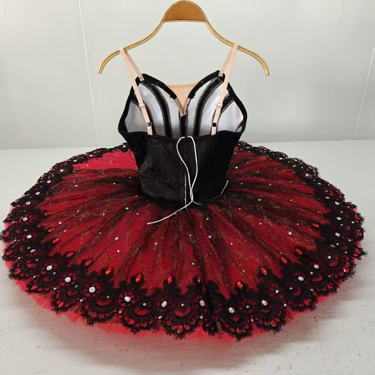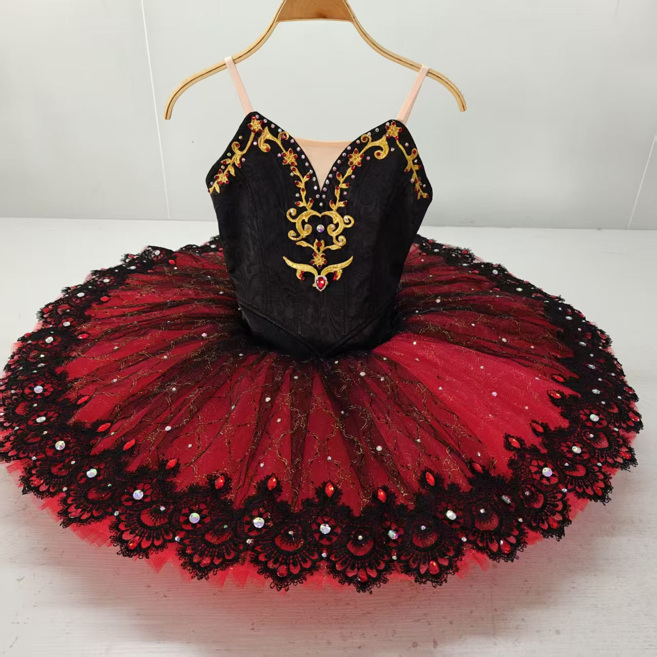 The professional, pancake tutu skirt, is created with 12 layers of red tulle, boasting a beautiful black top layer with stunning red and black decorations.