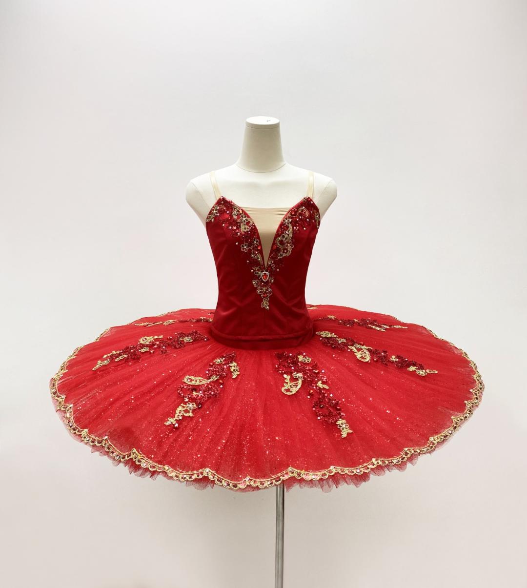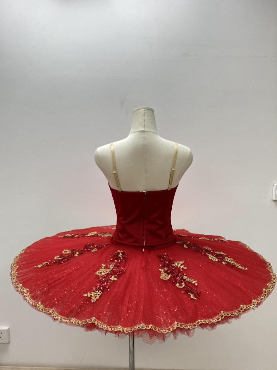 The professional twelve layers tutu skirt is red with gold embellishments on the edges, as well as a tutu skirt, matching the bodice. The top layer is created with red glitter tulle.