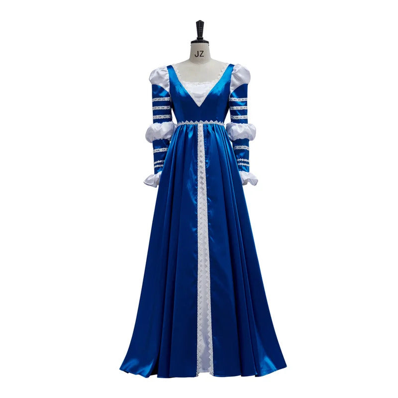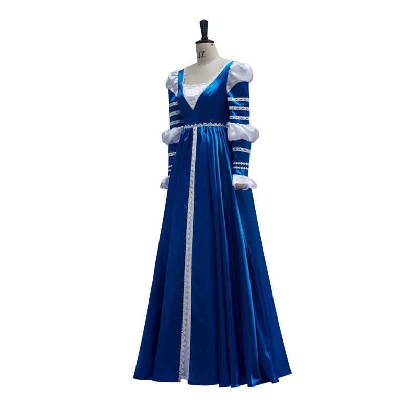 Made in a beautiful shade of deep blue satin, this dress features a V neck with a white satin insert, long sleeves made in the typical medieval style, and a long skirt with a white central insert.