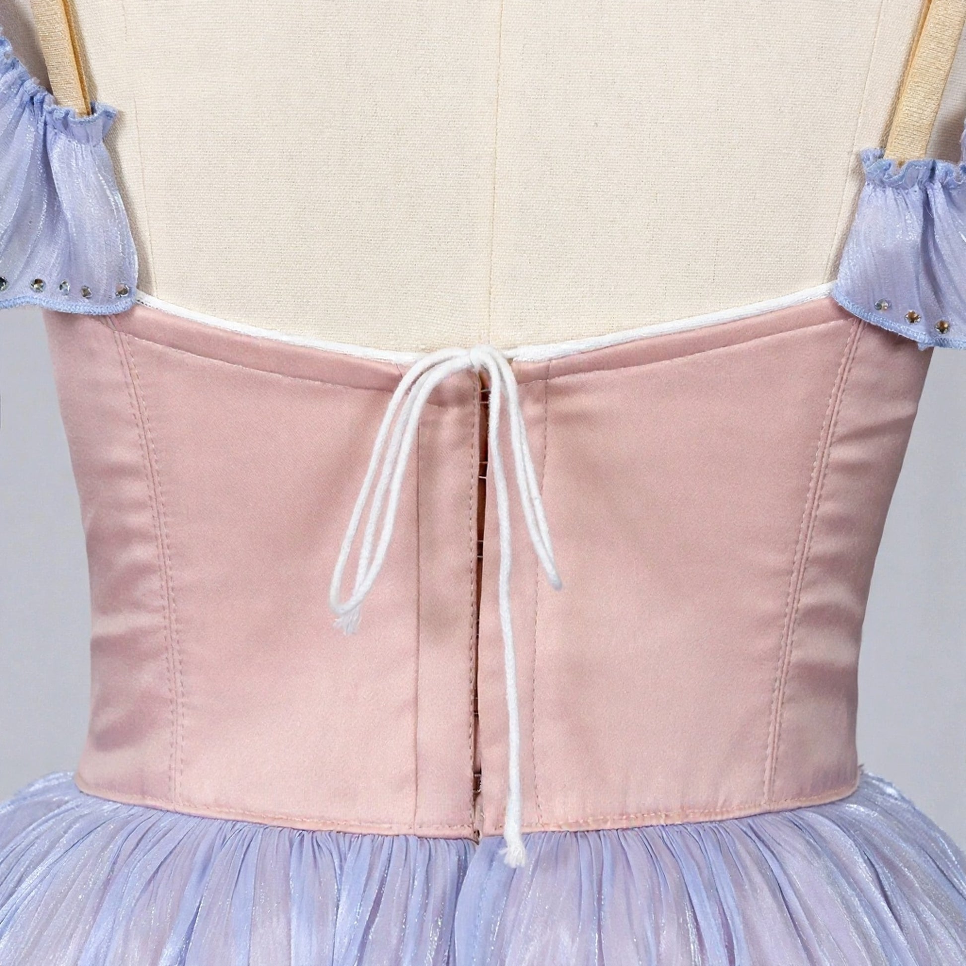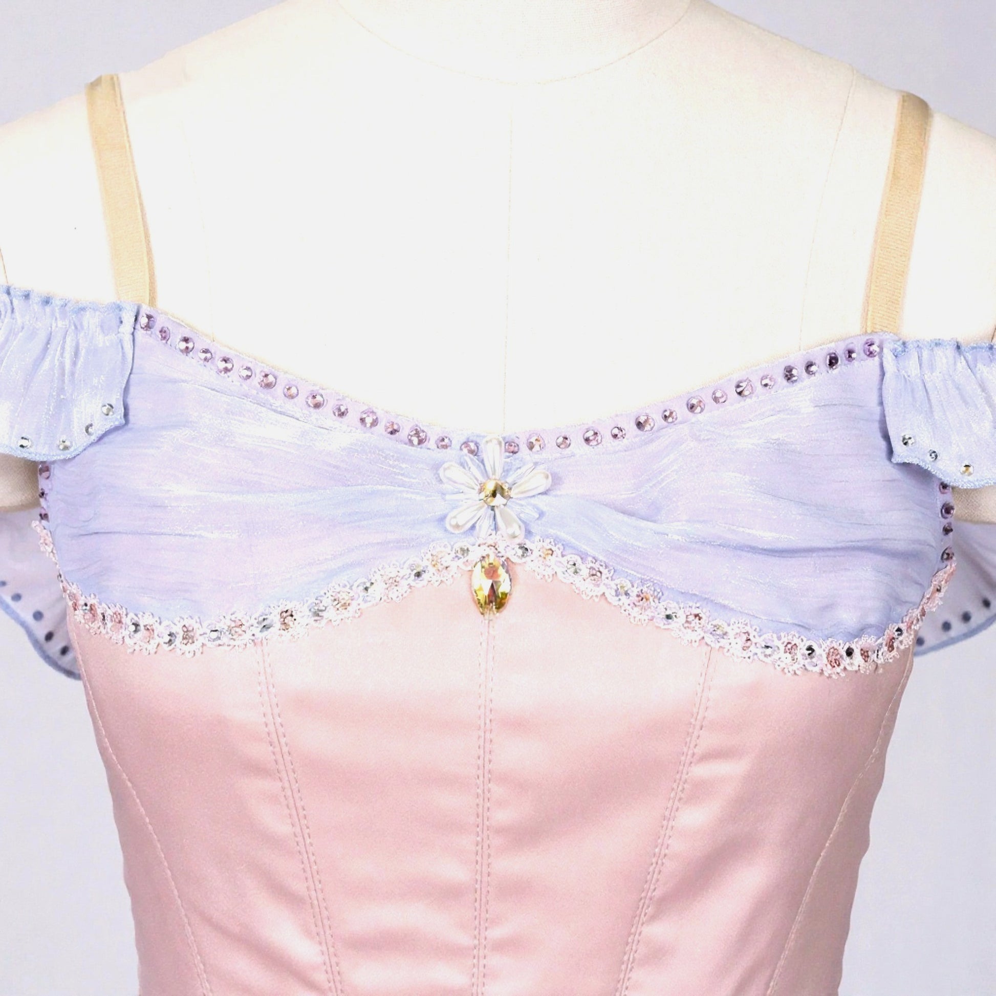 Satin bodice with lilac organza decorations, and lilac cap sleeves decorated with rhinestones.