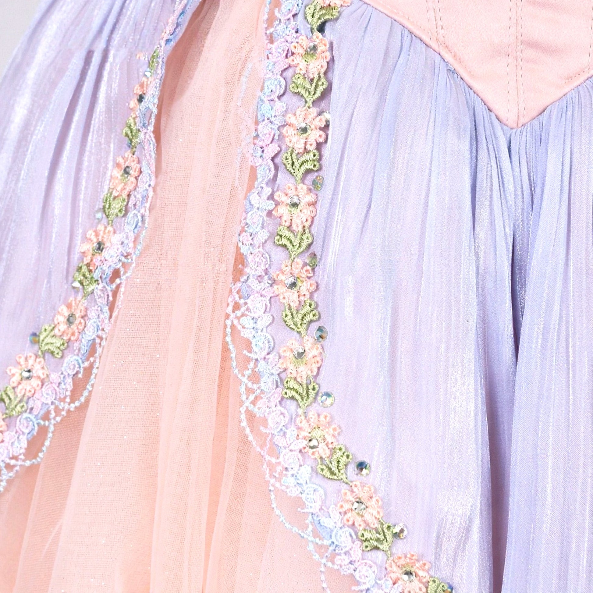 The tutu skirt is pink, and features a pale blue organza overlay embellished with flower appliques. The edges of the tutu are decorated with white lace.