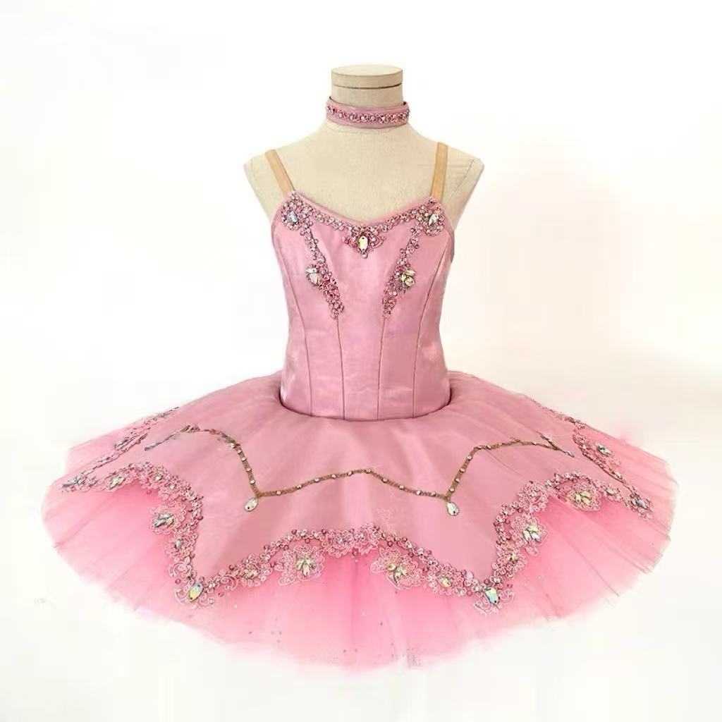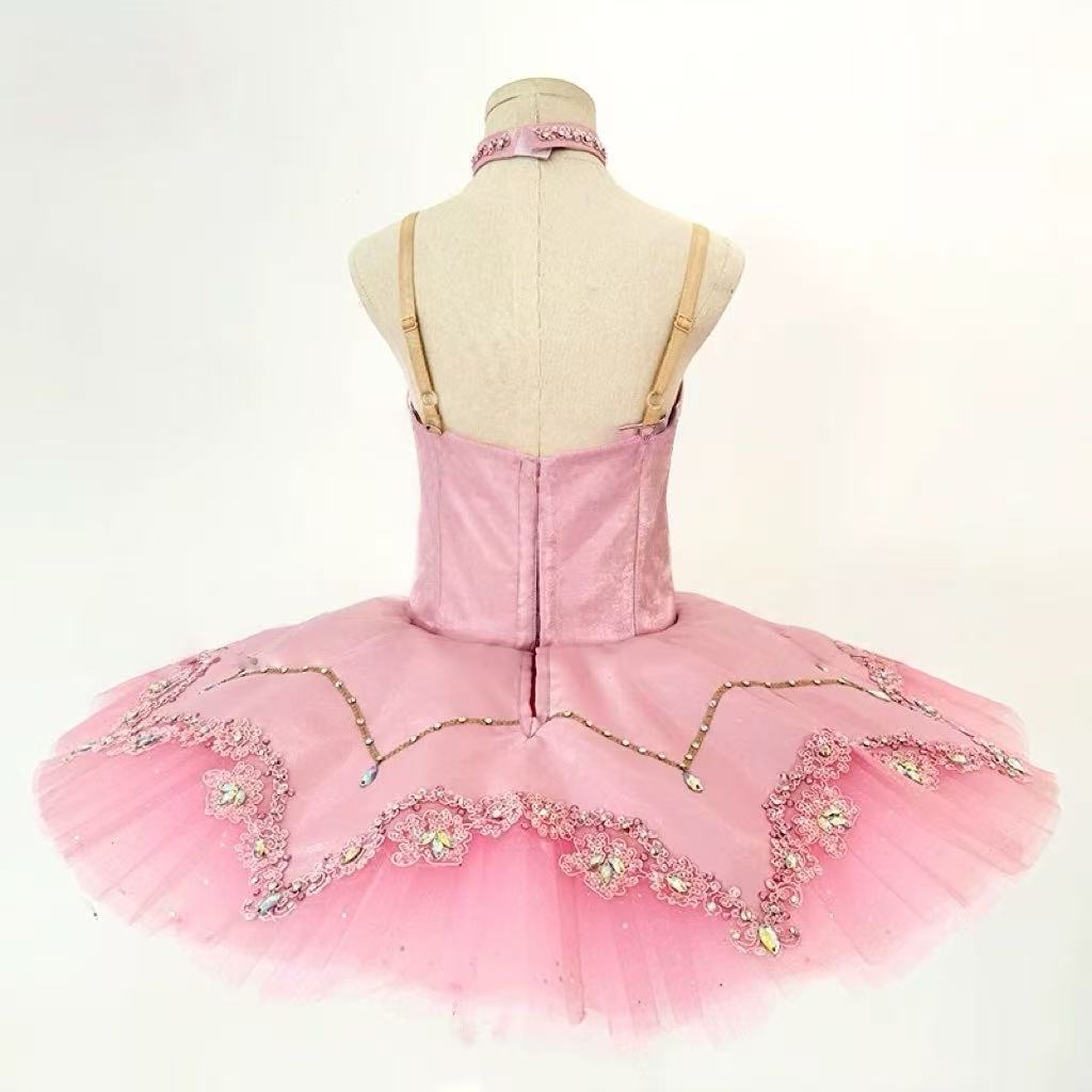 The bell-shaped tutu skirt is made with high quality pink tulle, and features a pink satin overlay, matching the bodice. The overlay is embroidered with pink trims, crystals, and pink flower appliques.