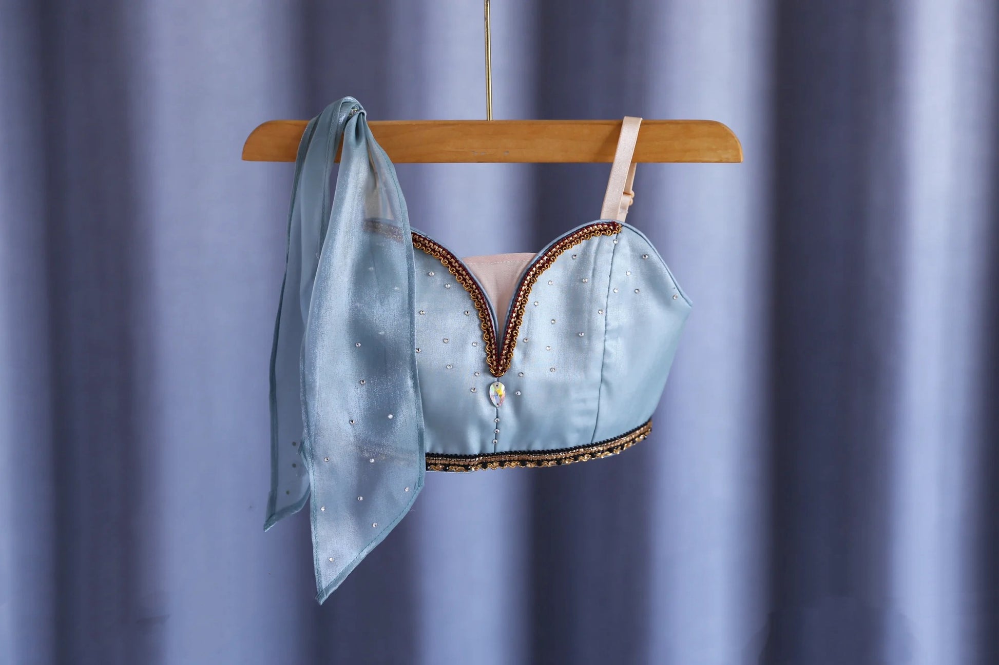 Professional top and skirt ballet costume for the role of Medora in the ballet "Le Corsaire".The short top is made with pale sky blue chiffon, and decorated with golden trims and with a chiffon scarf.