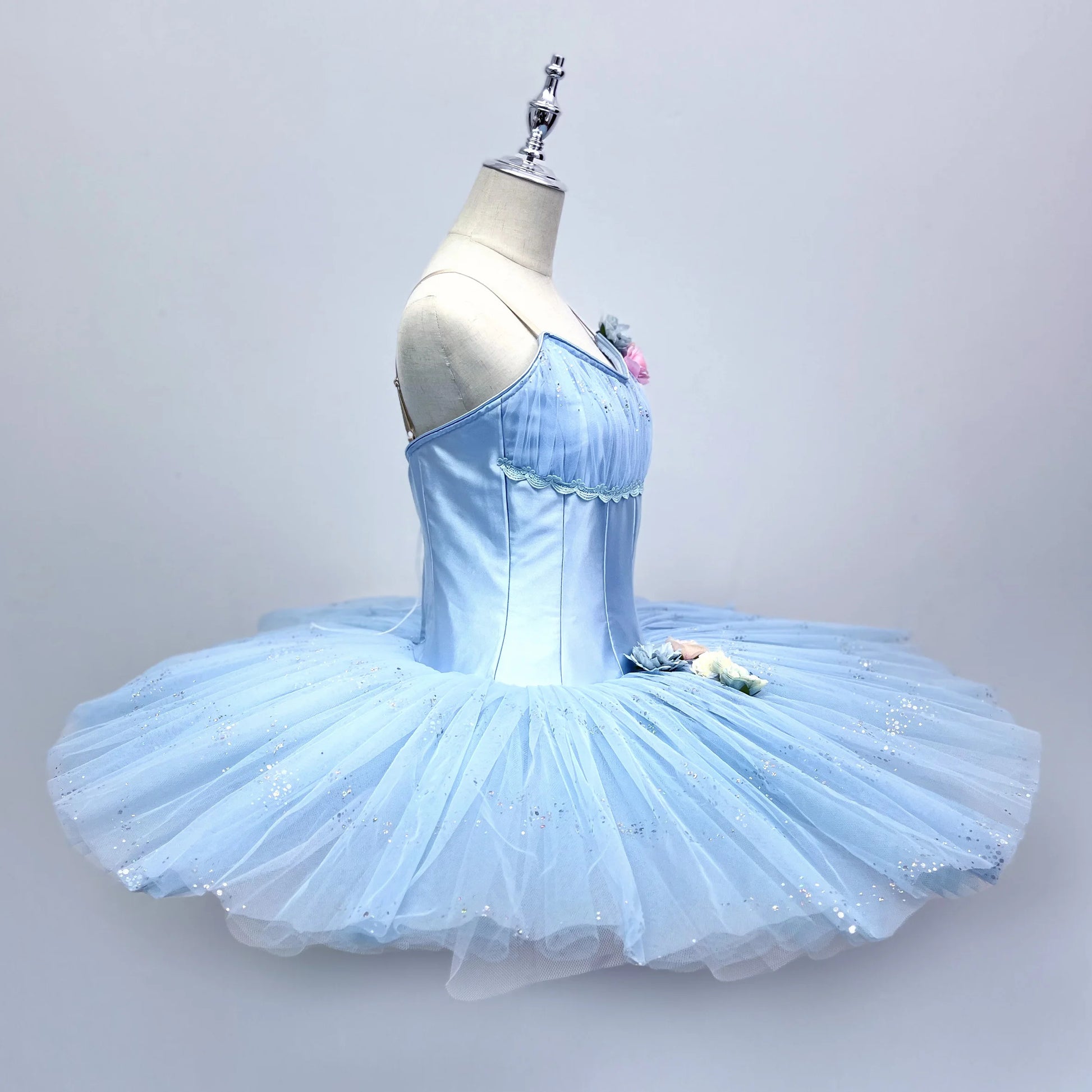 Shiny semi-stretchy sky blue bodice with rich silver appliques, crystals and flower decorations.