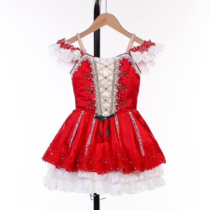 The costume has been made according to the classical tradition. The satin red bodice features a laced pattern with ivory undershirt, white lace, and flower appliques. White and red lace cap sleeves. The knee length, red satin skirt is embellished with two rows of white lace frills, and a white underskirt.