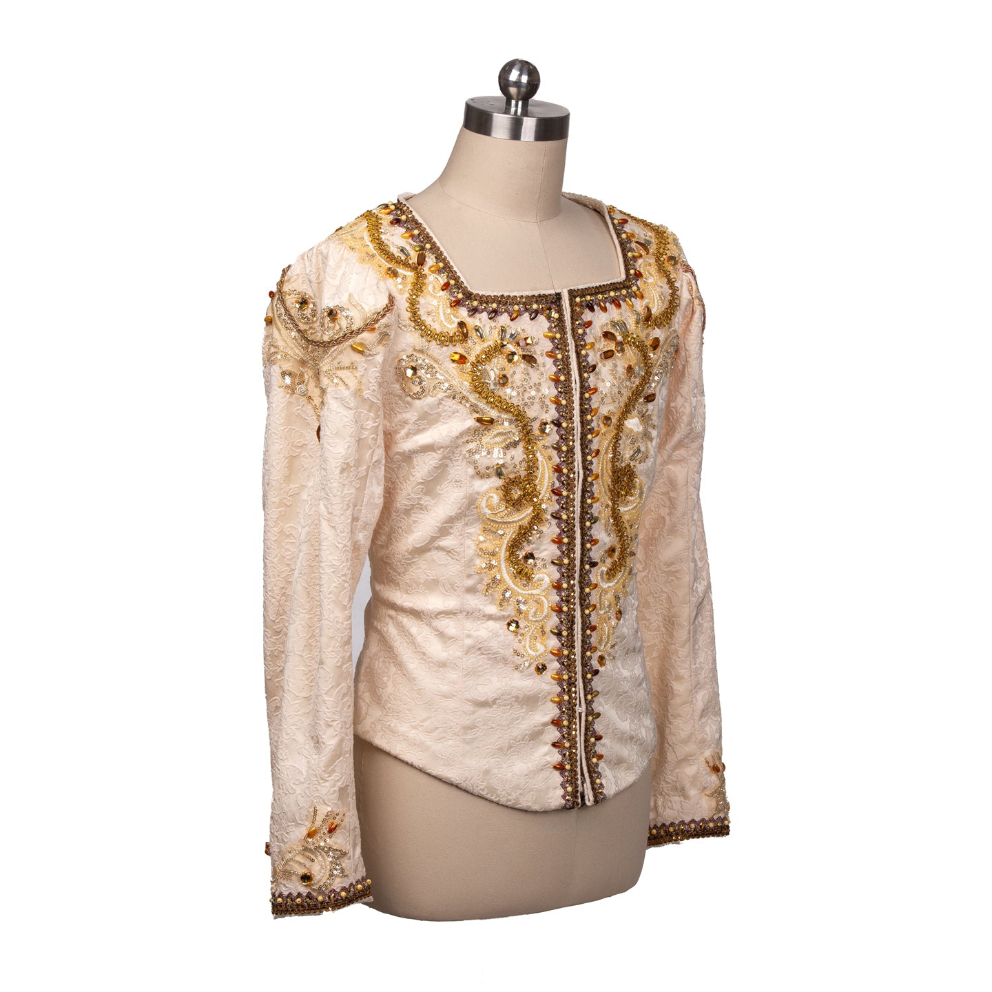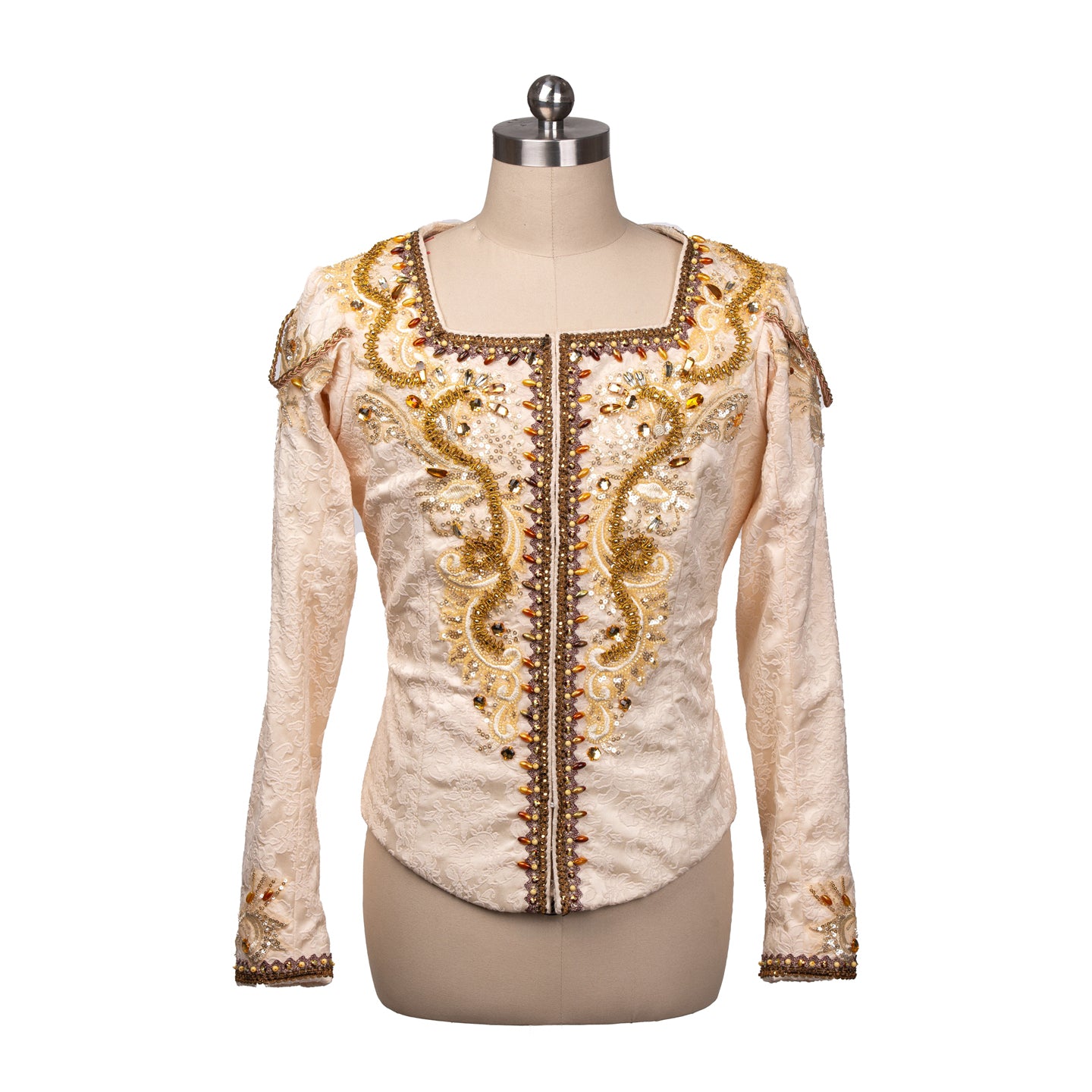 Long sleeves decorated in gold. Front closing with hooks and eyes.