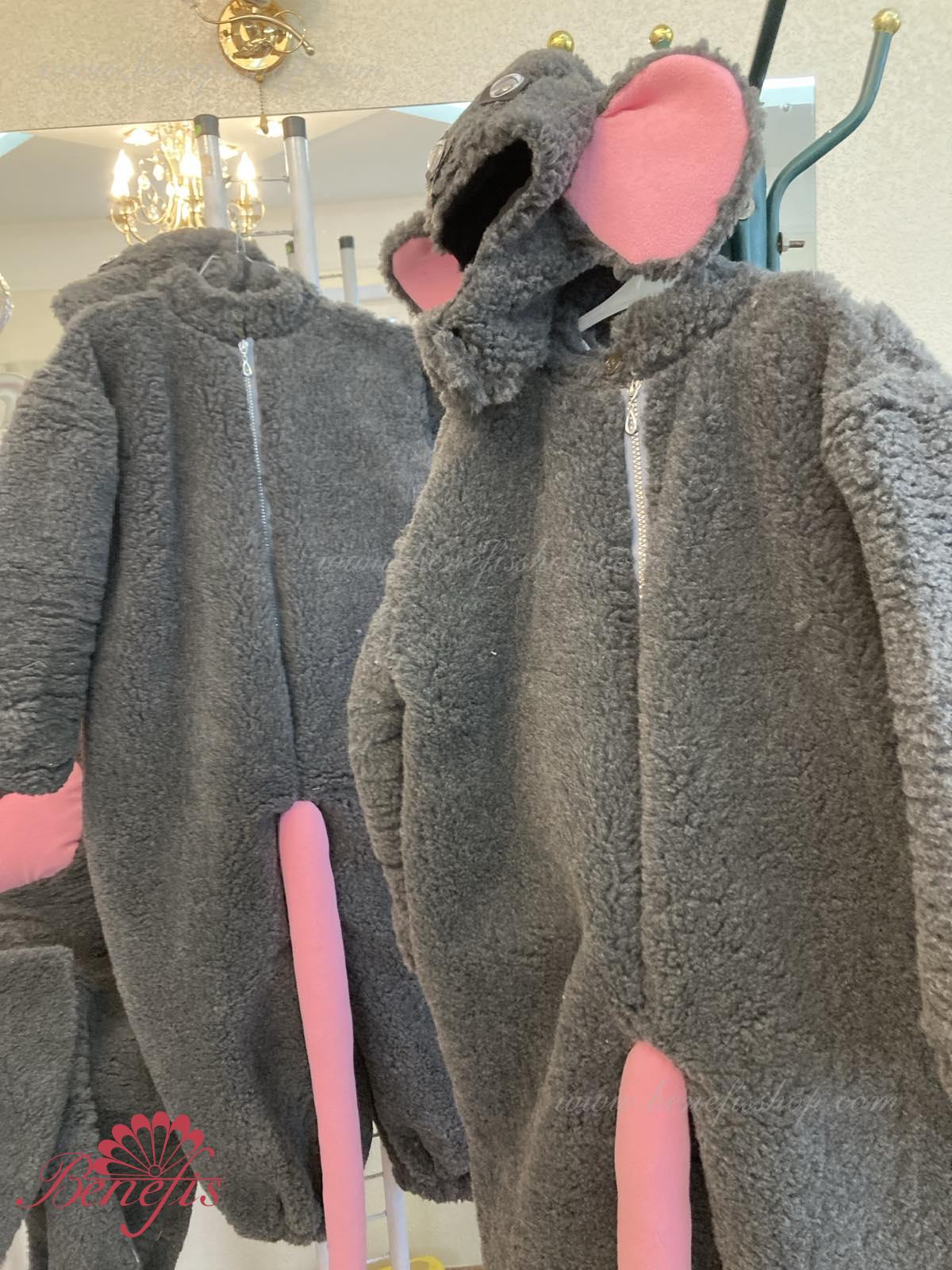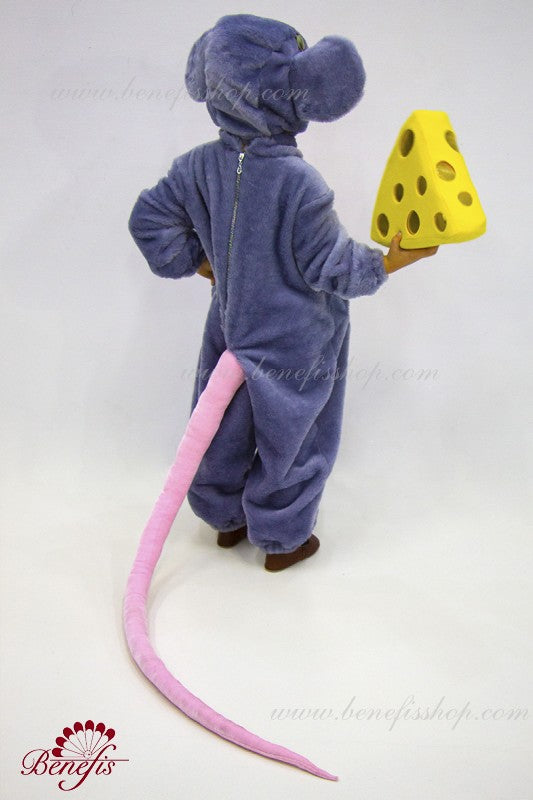 Details: jumpsuit, haead, cheese. Fur jumpsuit (fleece belly), zipper at the back. There is filler in the belly. The head is separate. Foam yellow cheese.
