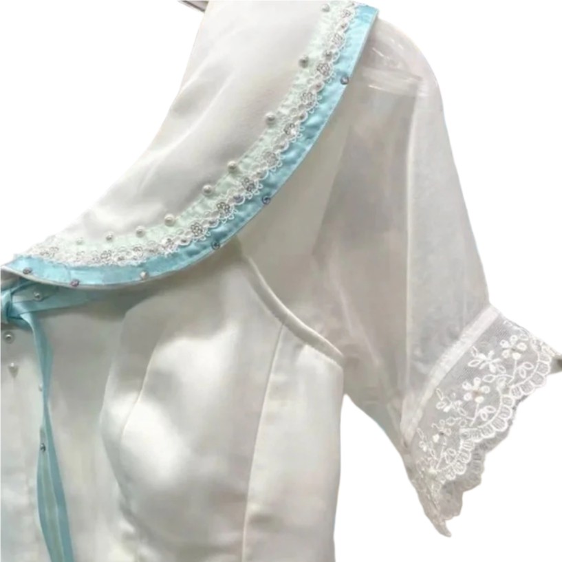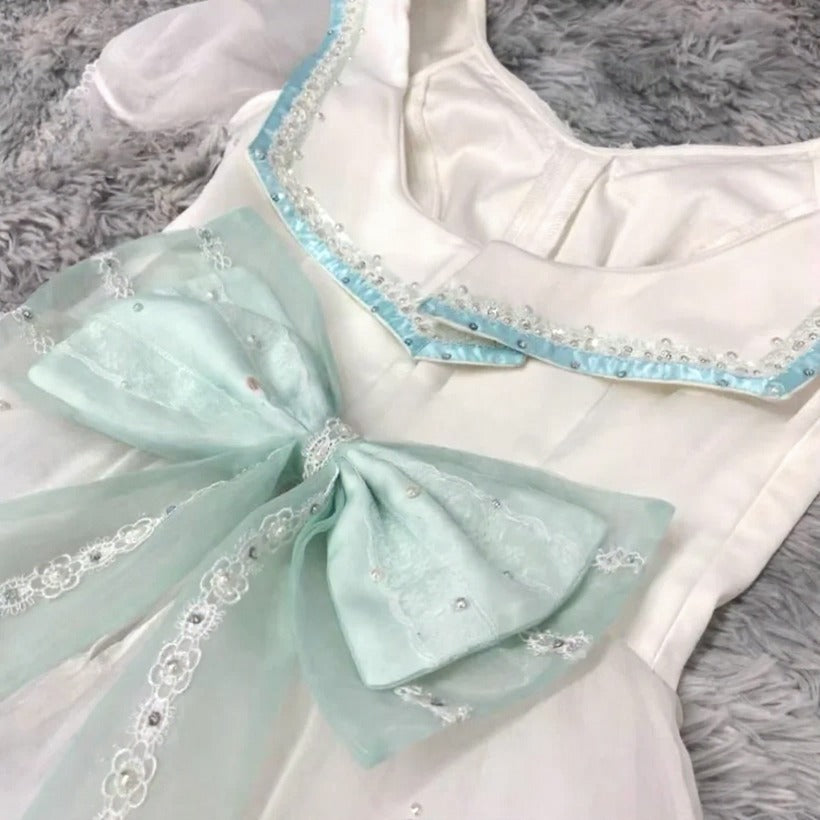White, V-shaped bodice with hooks and eyes closure, three-quarter sleeves ans mint green decoration trims.