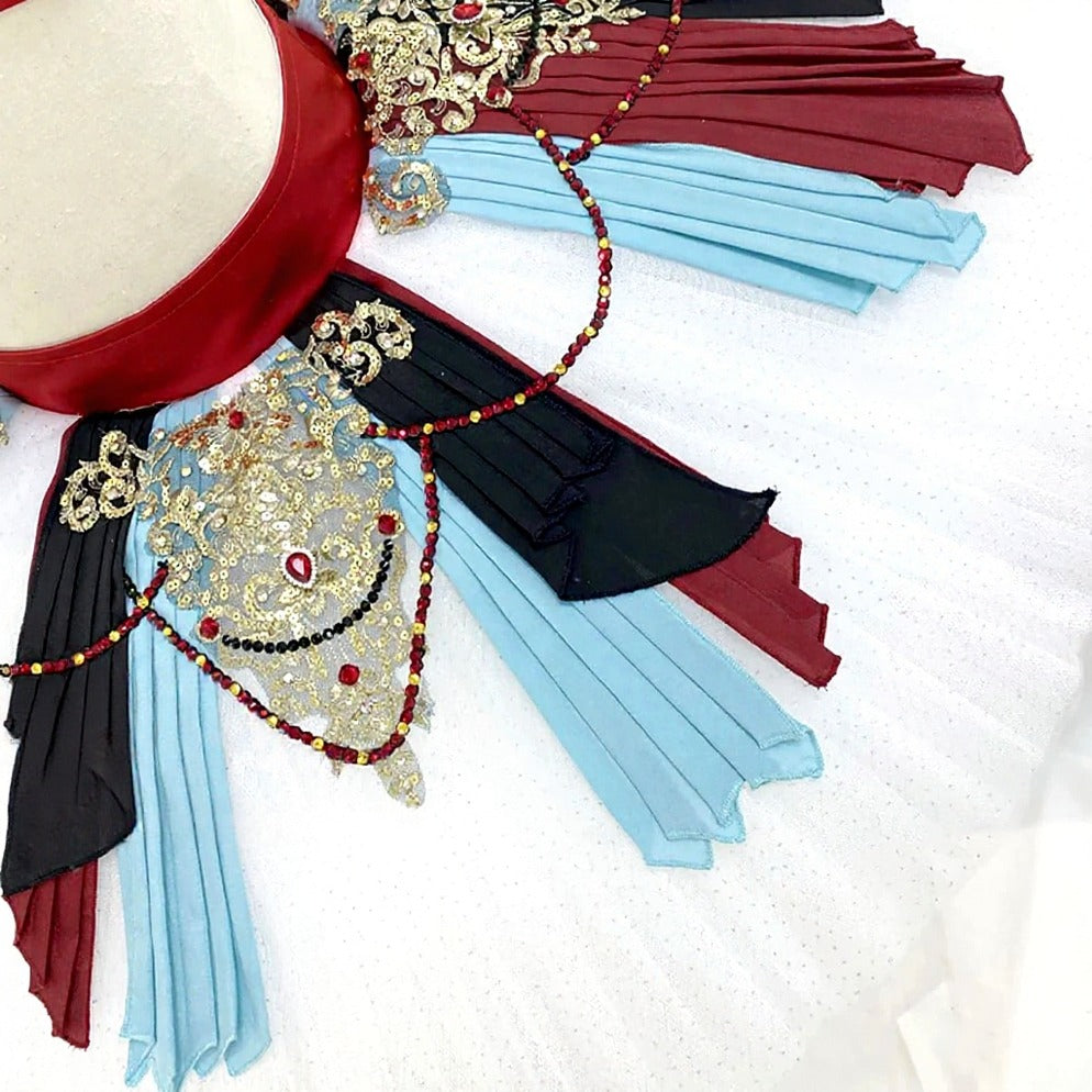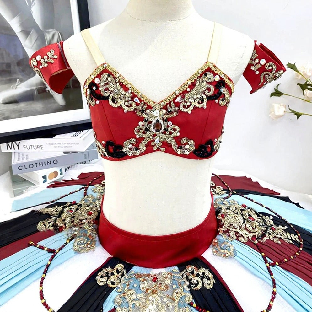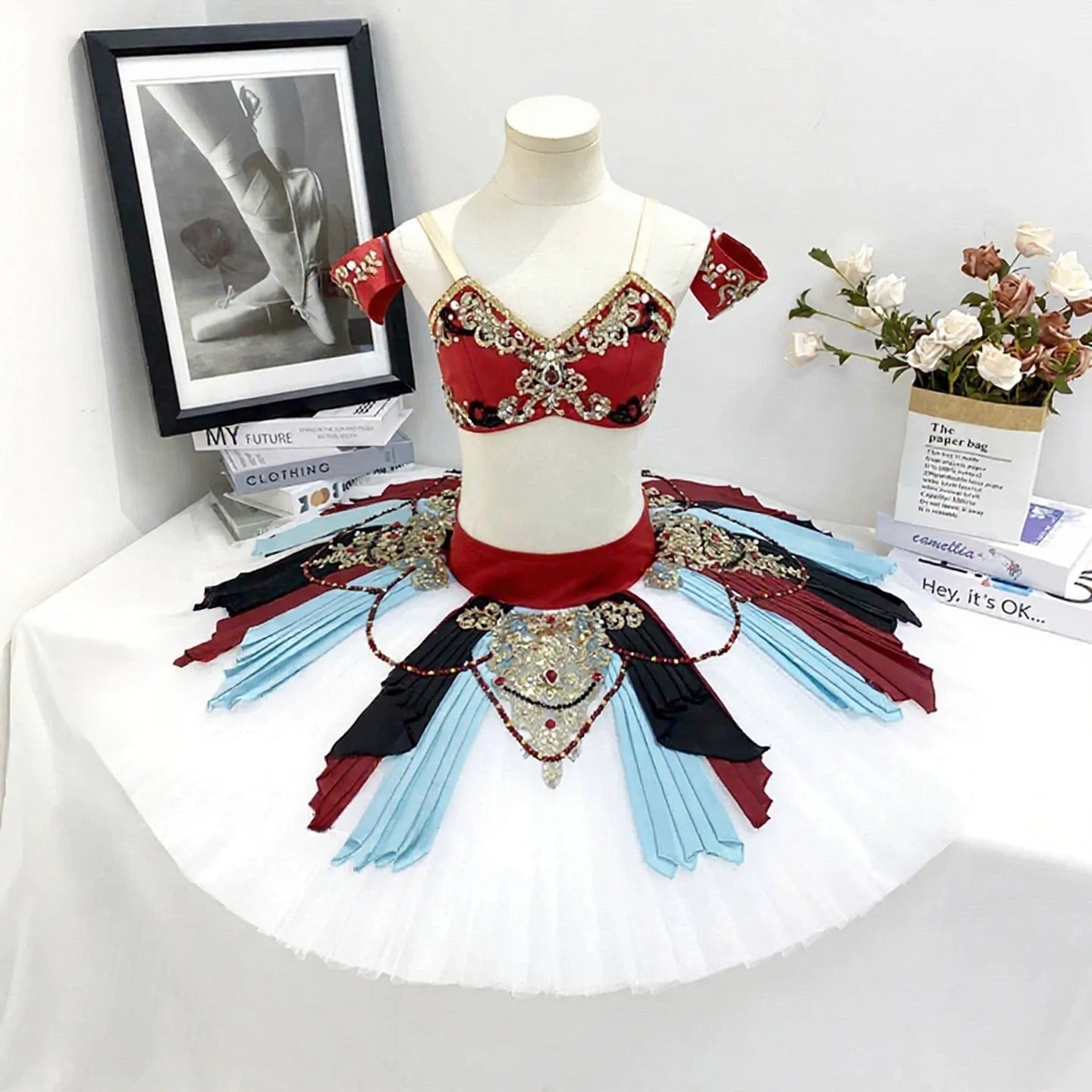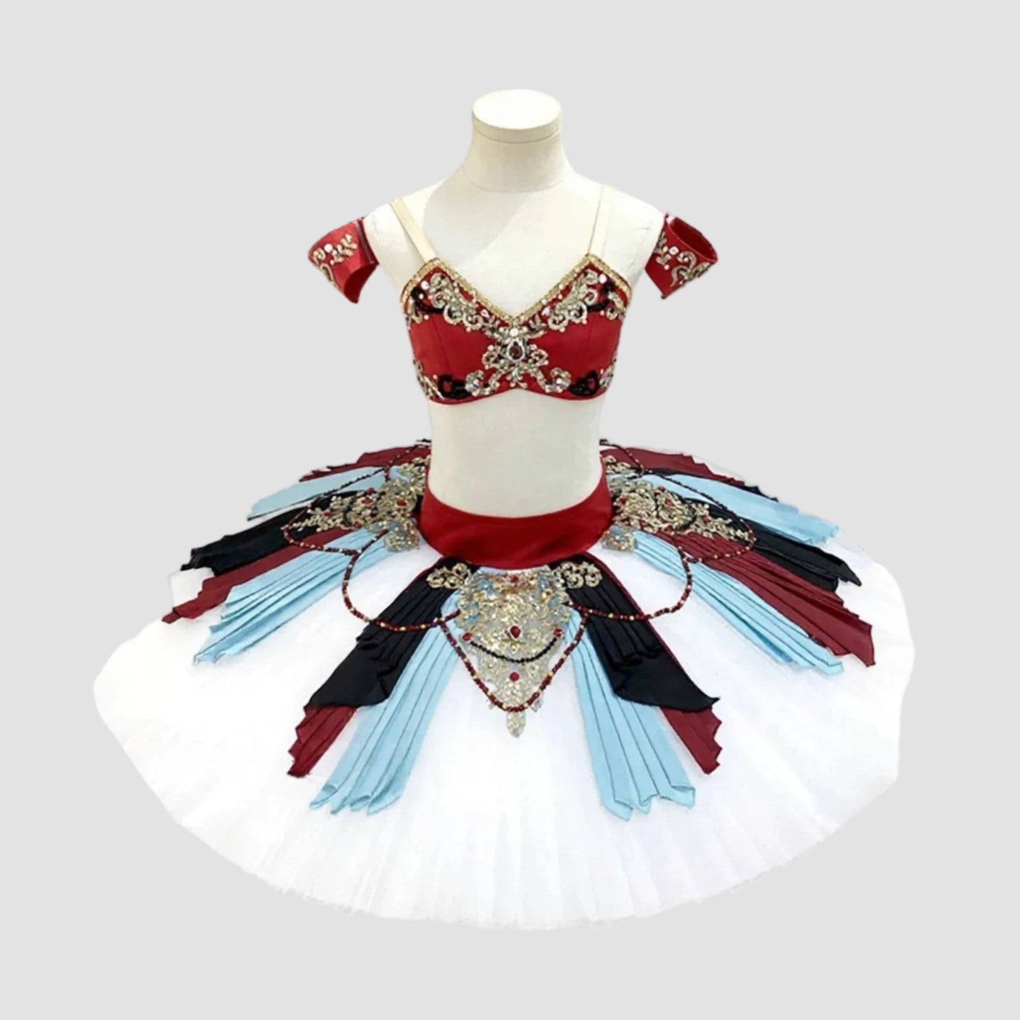 Costume made with burgundy short top, richly decorated in gold and black, and matching arm bracelets. The bell-shaped, white tutu skirt features a burgundy waist band, and is decorated with impressive golden decorations, and black, blue and burgundy geometric motifs.