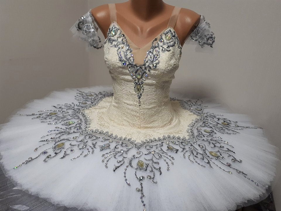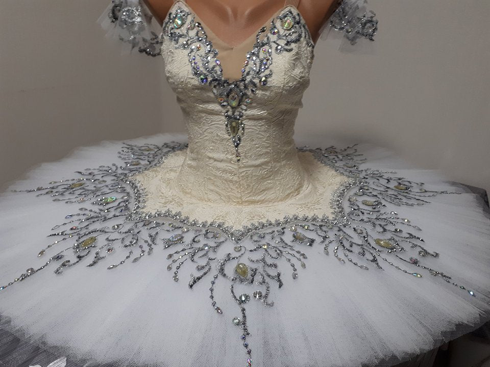 The white, hooped, 12 layers tutu skirt is totally embroidered in silver, making this costume extremely shiny under the stage lights.