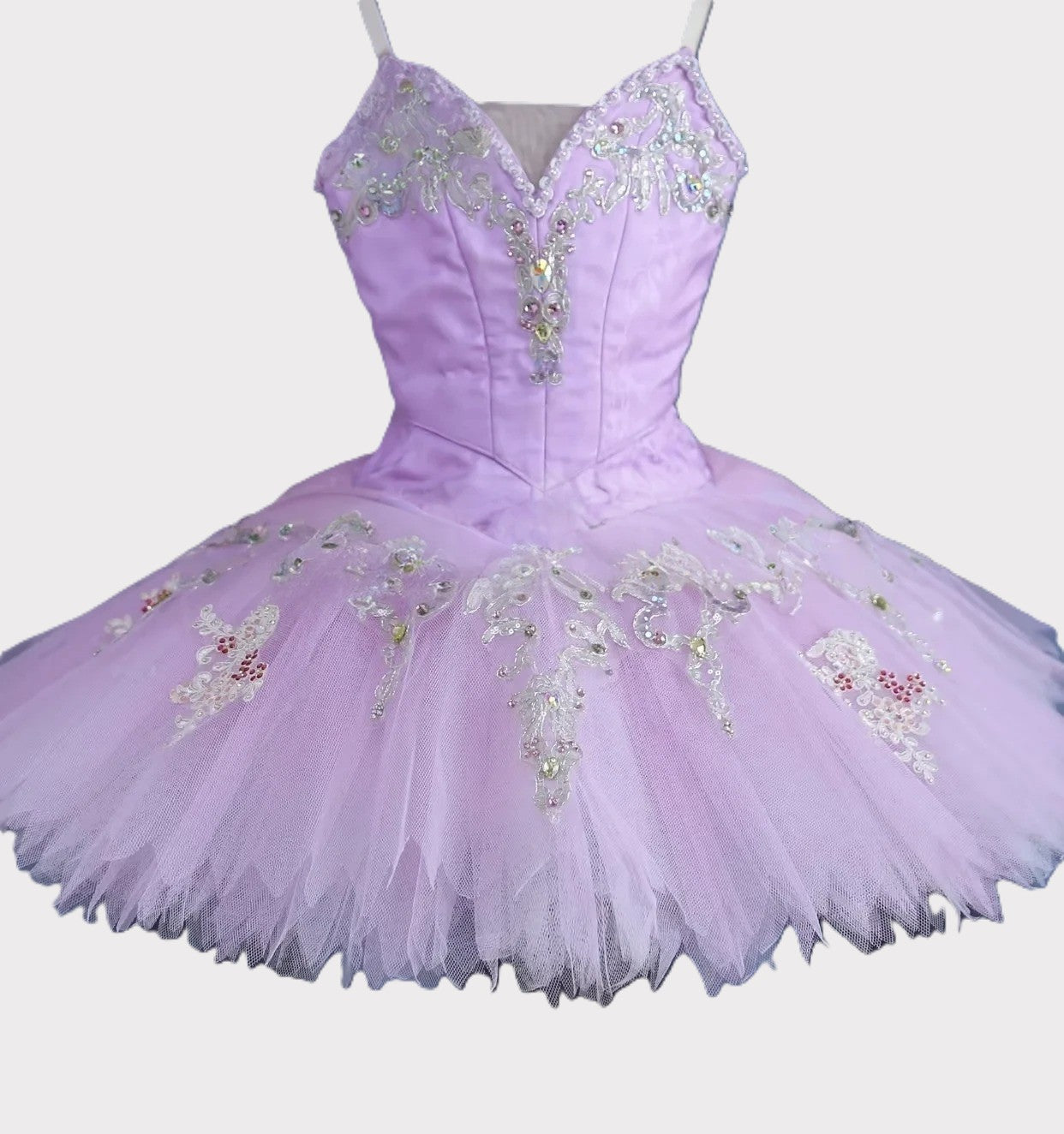 Pale lilac, bell shaped ten layers tutu skirt, made with high quality lilac tulle, and glittery top layer. Silver shiny appliques and crystals decorate the tutu skirt.