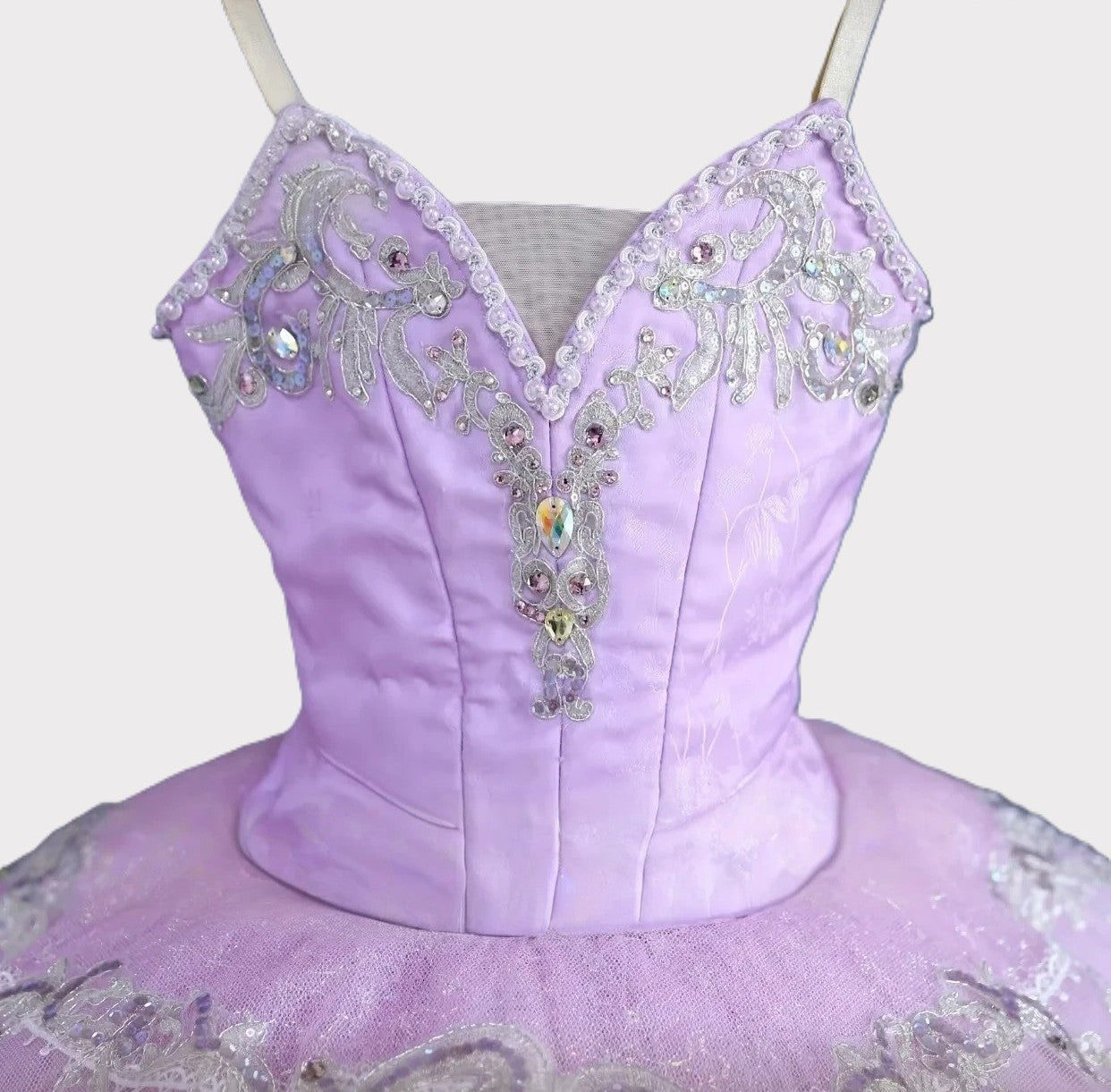 Pale lilac satin bodice with silver appliques and crystals, V neck, and mesh insert.