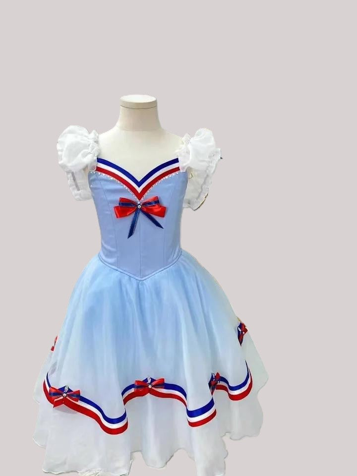 The Romantic tutu skirt has been hand dyed, featuring gradient shades of pale blue, looking as soft as a cloud, embellished by blue, white and red trims and bows, towards the edges of the skirt.