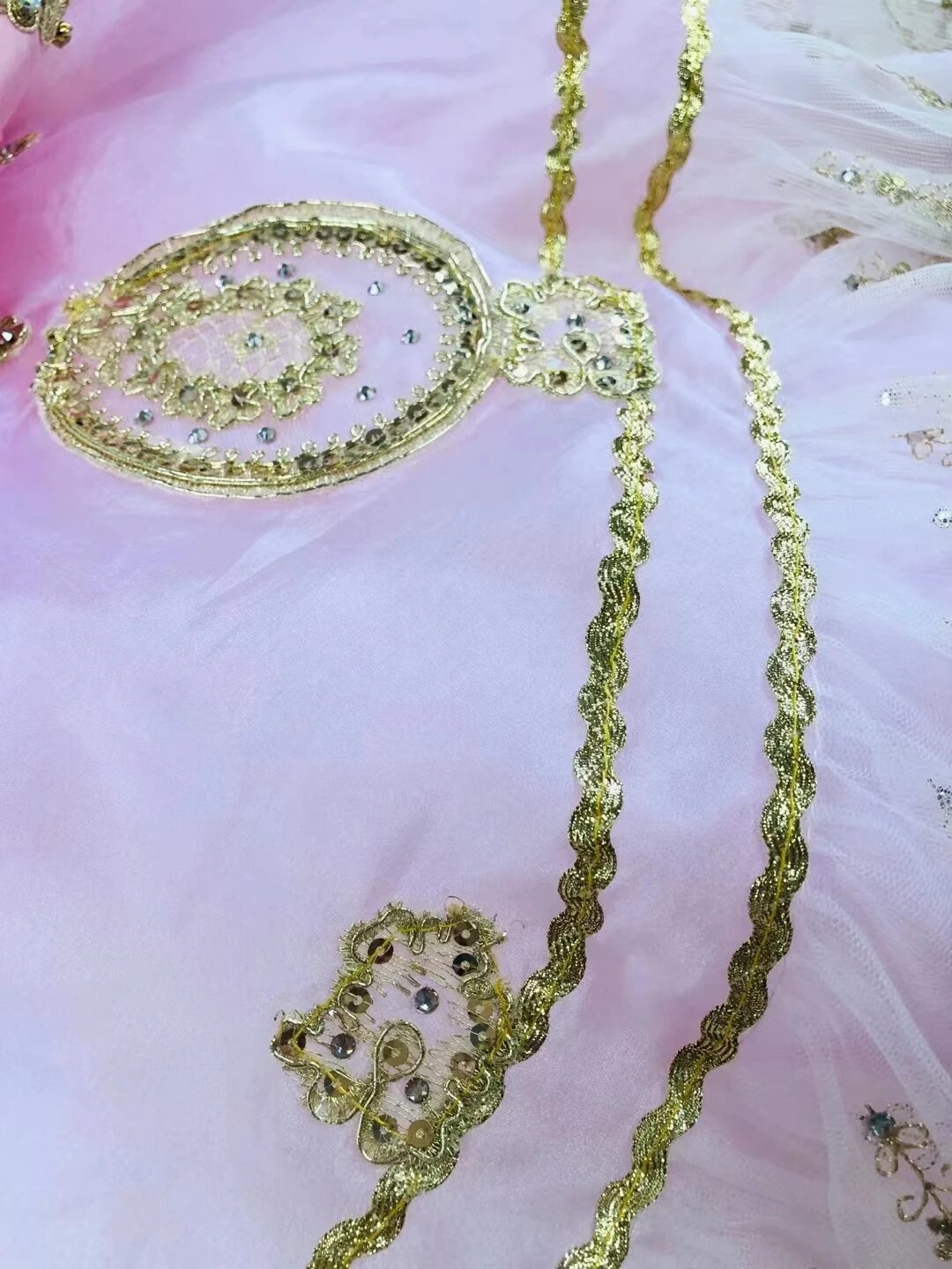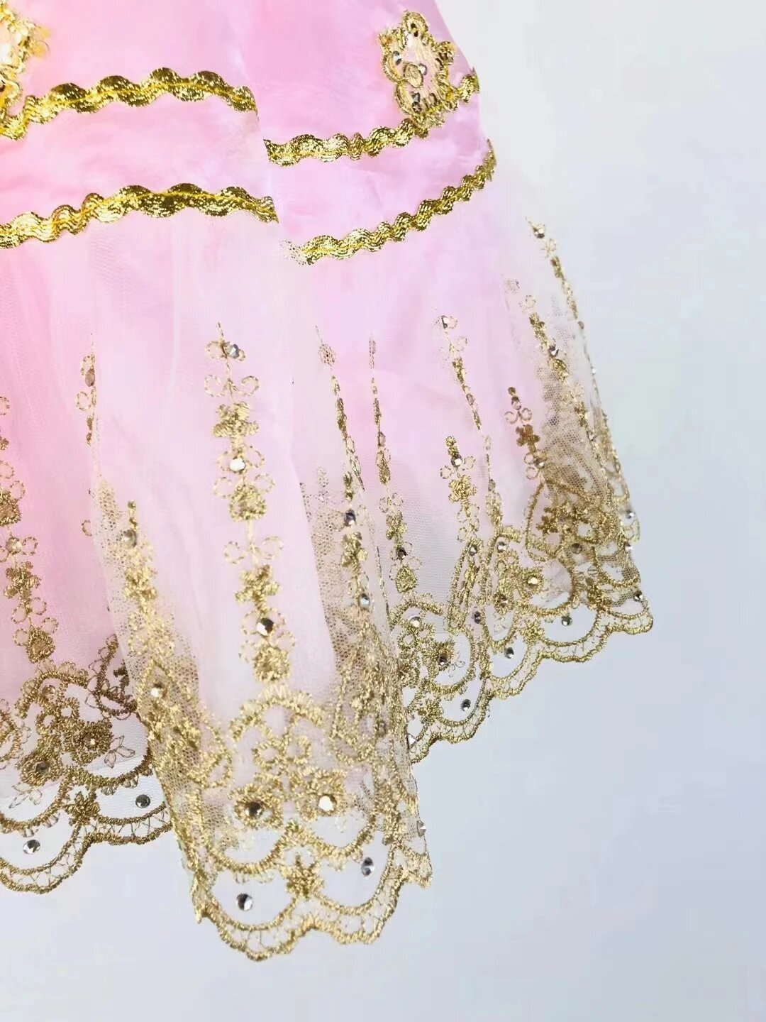 Calf length pink tutu skirt richly embroidered in gold.