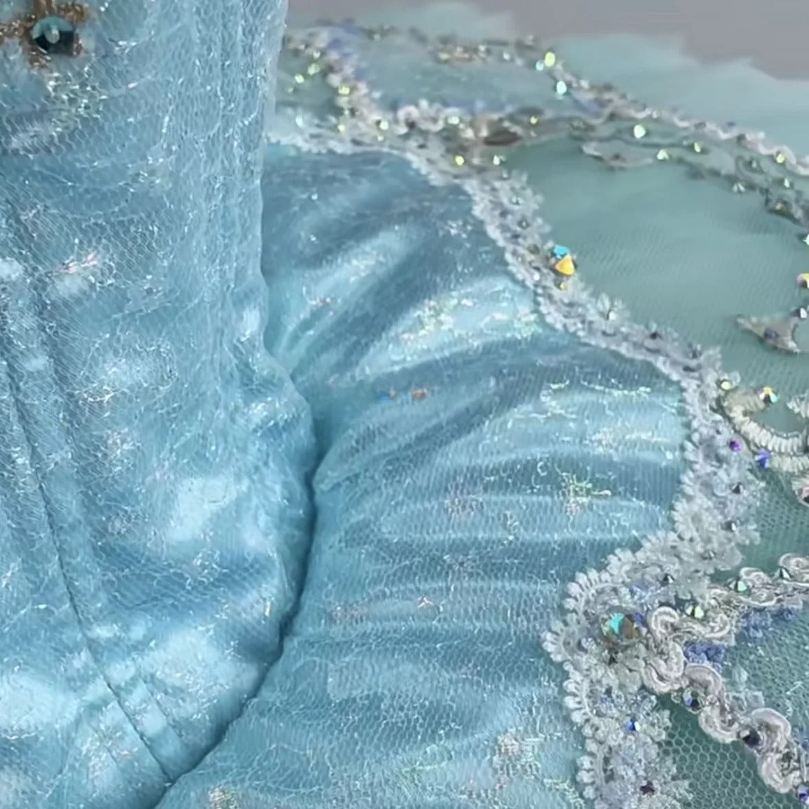The aqua bodice is made with high quality satin, and features one of the richest decorations in all our Collection. There are silver trims and appliques that make the bodice of this tutu really unique, as well as hundreds of sparkles and crystals. The bodice also features a deep V in the front with nude mesh insert, and fastens in the back with a double row of hooks and eyes.