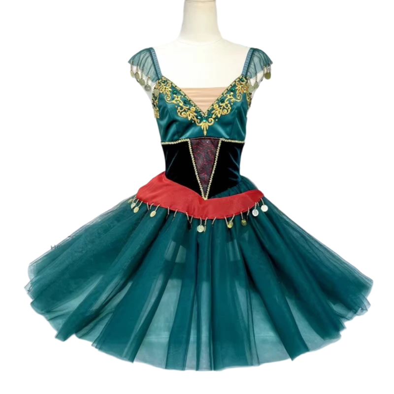 The knee length tutu skirt is deep green to match the bodice, and embellished with a red scarf sewn around the waist. Golden coins decorate the scarf, according to the gypsy style of the dress.