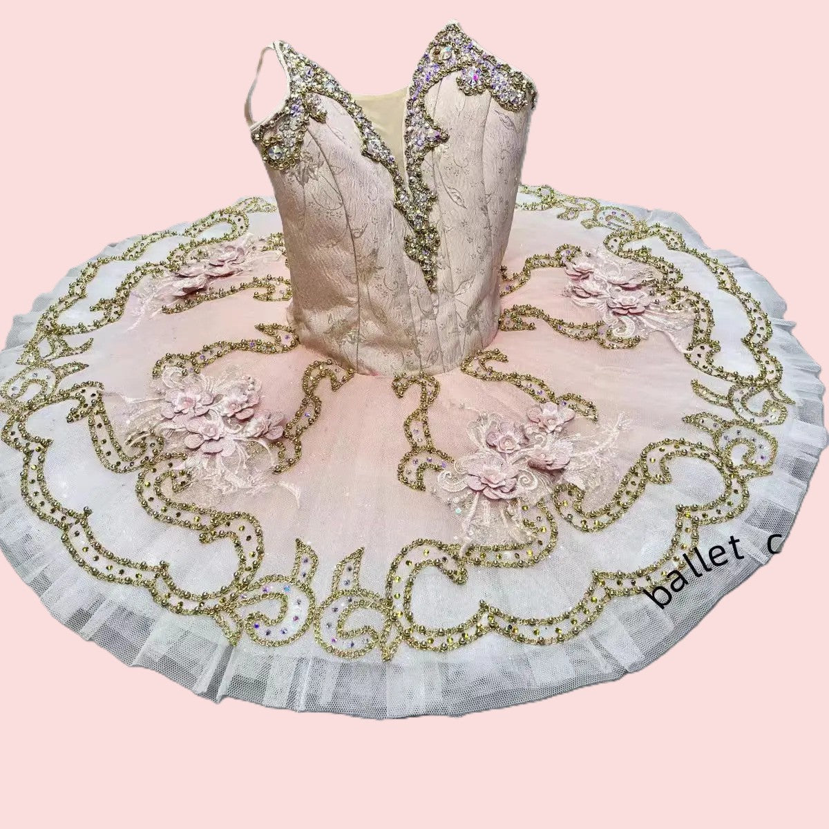 The professional, 12 layers tutu skirt is hand dyed in gradient shades of pink. The top layer of the skirt features graded shades of pink to match the bodice. It is entirely decorated with gold appliques, pink floral motifs and golden pearls, creating a wonderful contrast, and a wonderful, shiny stage effect.