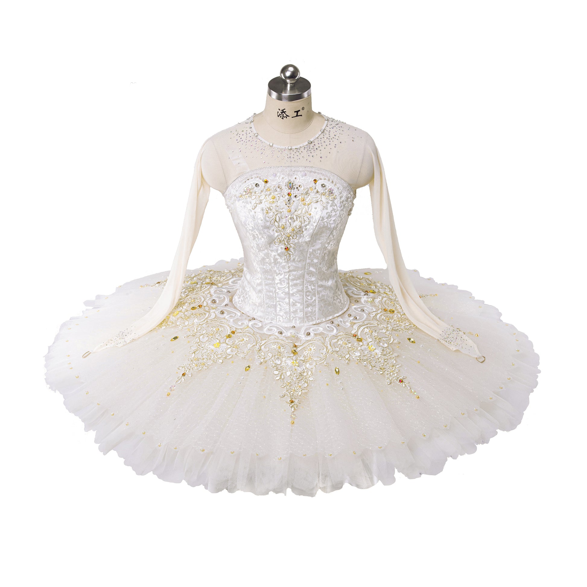 This ivory professional tutu is an exclusive creation for the most demanding ballerinas. The bodice is made with ivory brocade and richly decorated with gold appliques, crystals and white pearls. It features a mesh neckline embellished with sparkles, and long ivory, mesh sleeves.