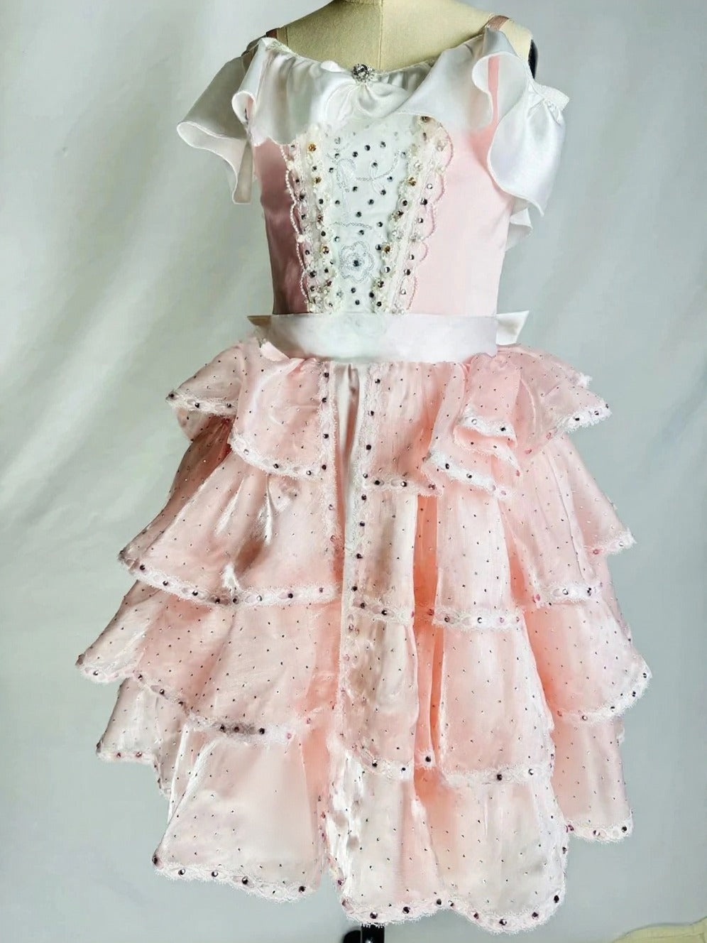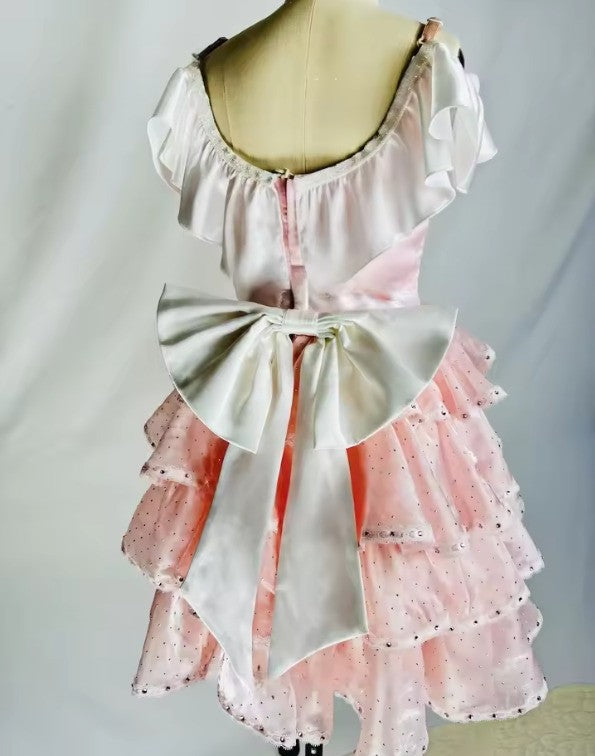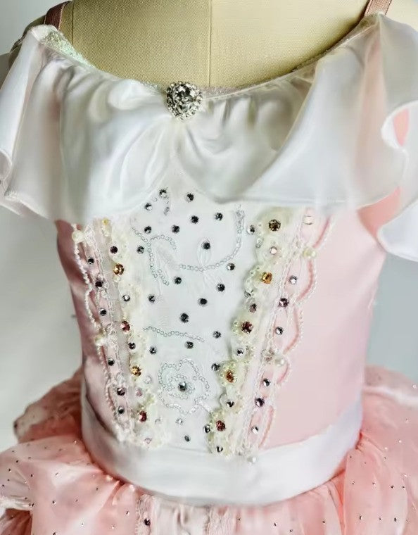 Pale pink, satin bodice with white insert decorated with crystals. Round neck embellsihed with white satin frill. White satin belt fastening in the back with a big bow.