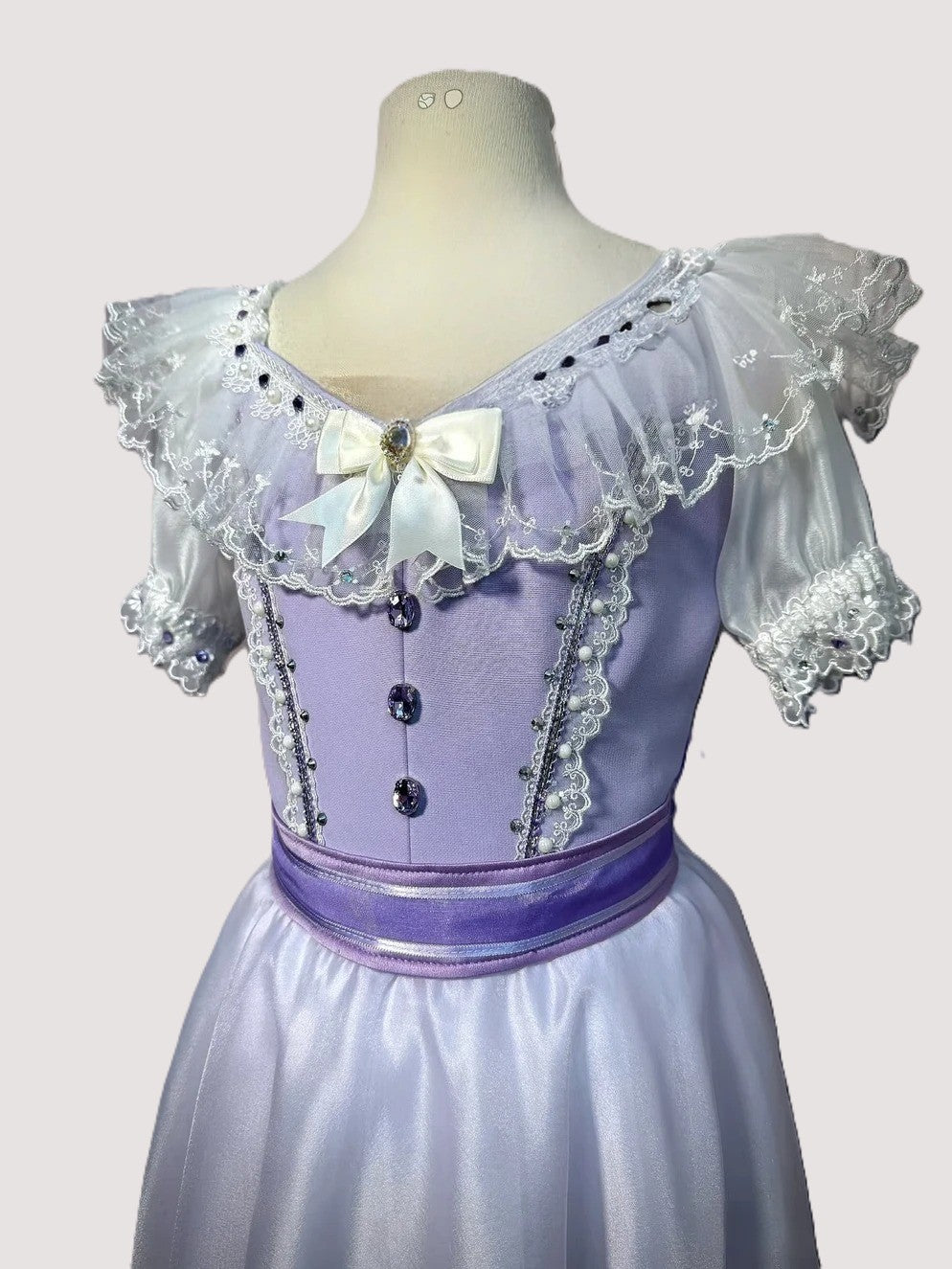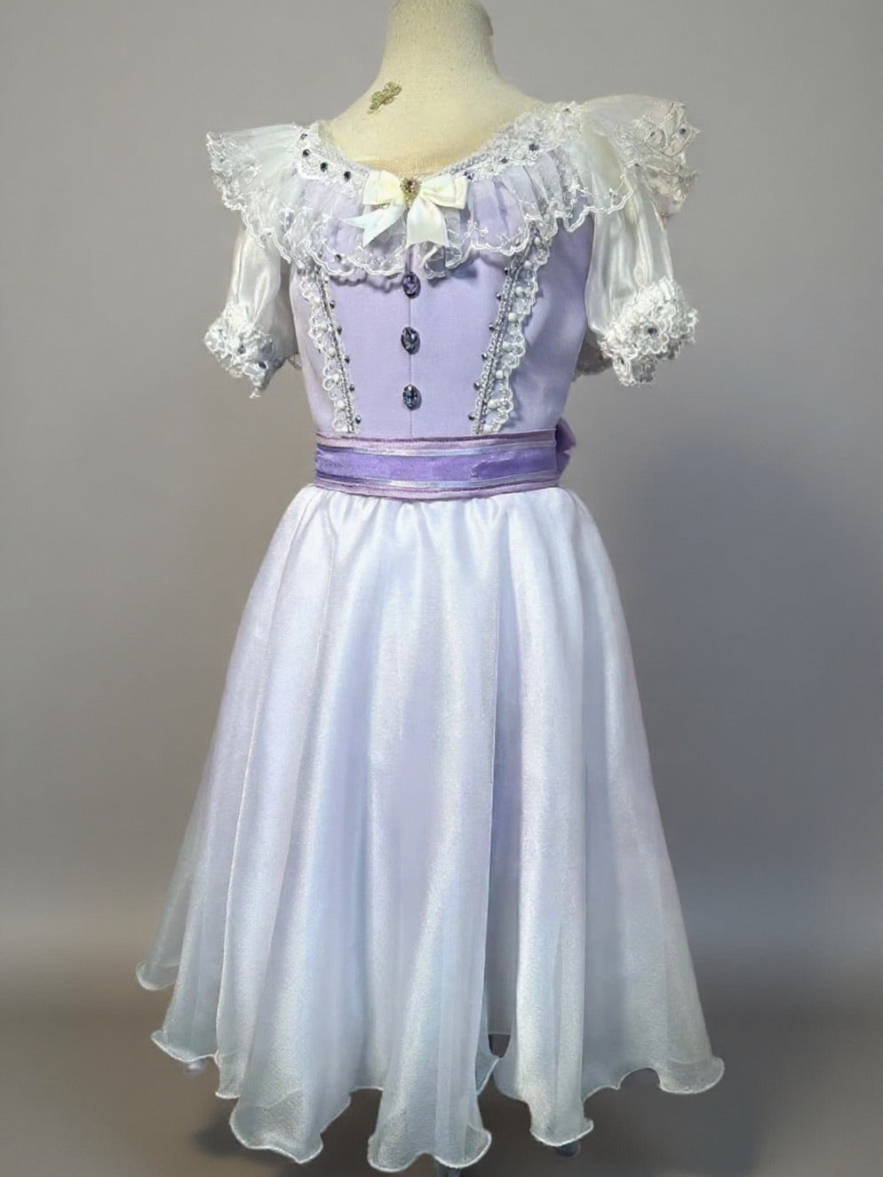 This elegant dress is made with created in a lovely shade of pale lilac. Round neck lilac top part, with rich white lace decorations, crystal buttons, bows, white three-quarter sleeves, and a wide lilac sash ending with a big bow in the back.