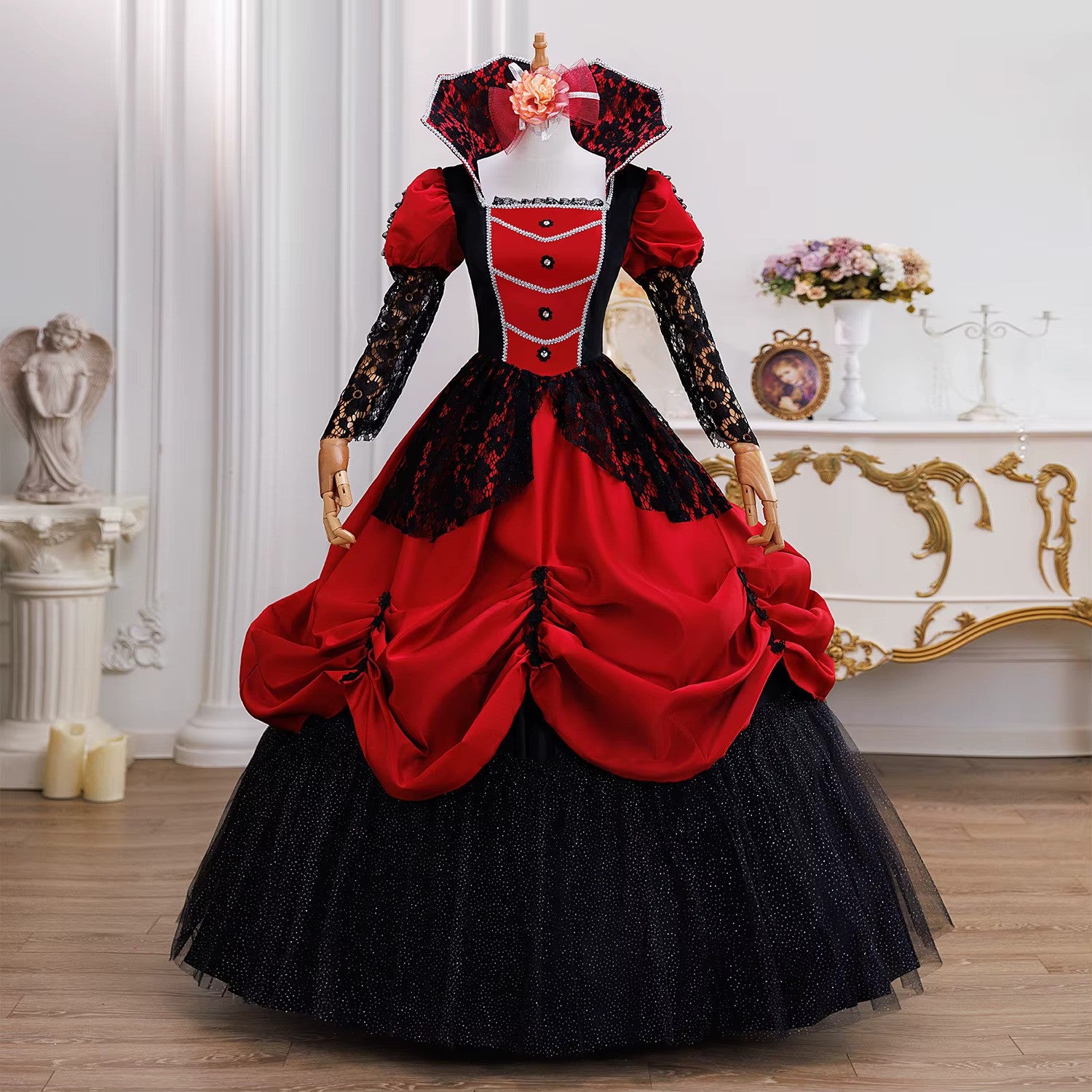 This Victorian costume features a red and black bodice, red and black lace long sleeves, and gold decorations.
