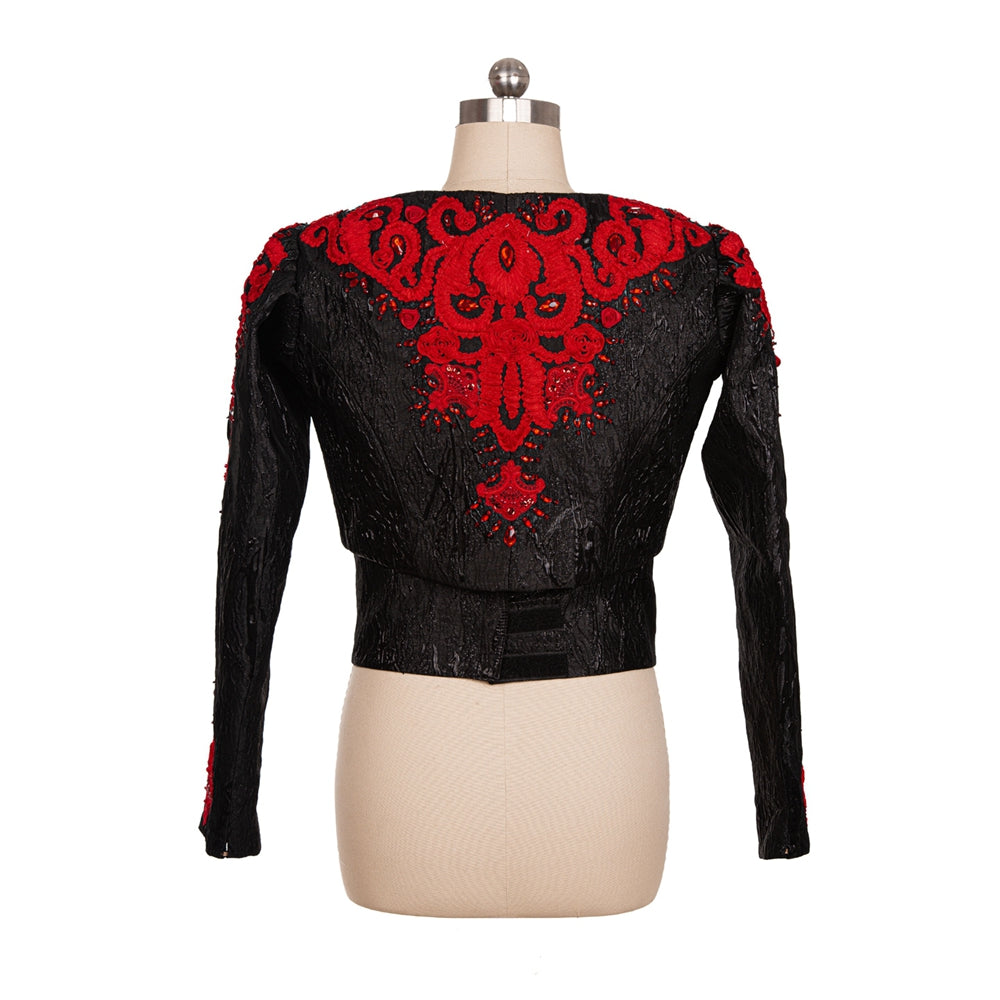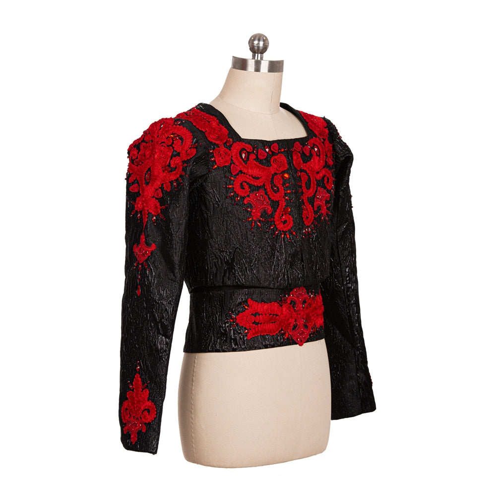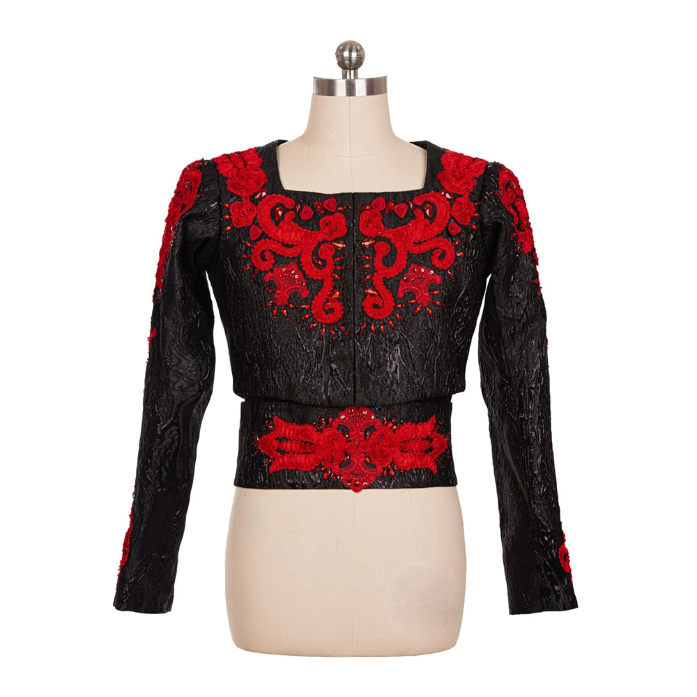 This impressive black and red stage costume features a black brocade fitted jacket with square neck, richly embroidered with red appliques and crystals.