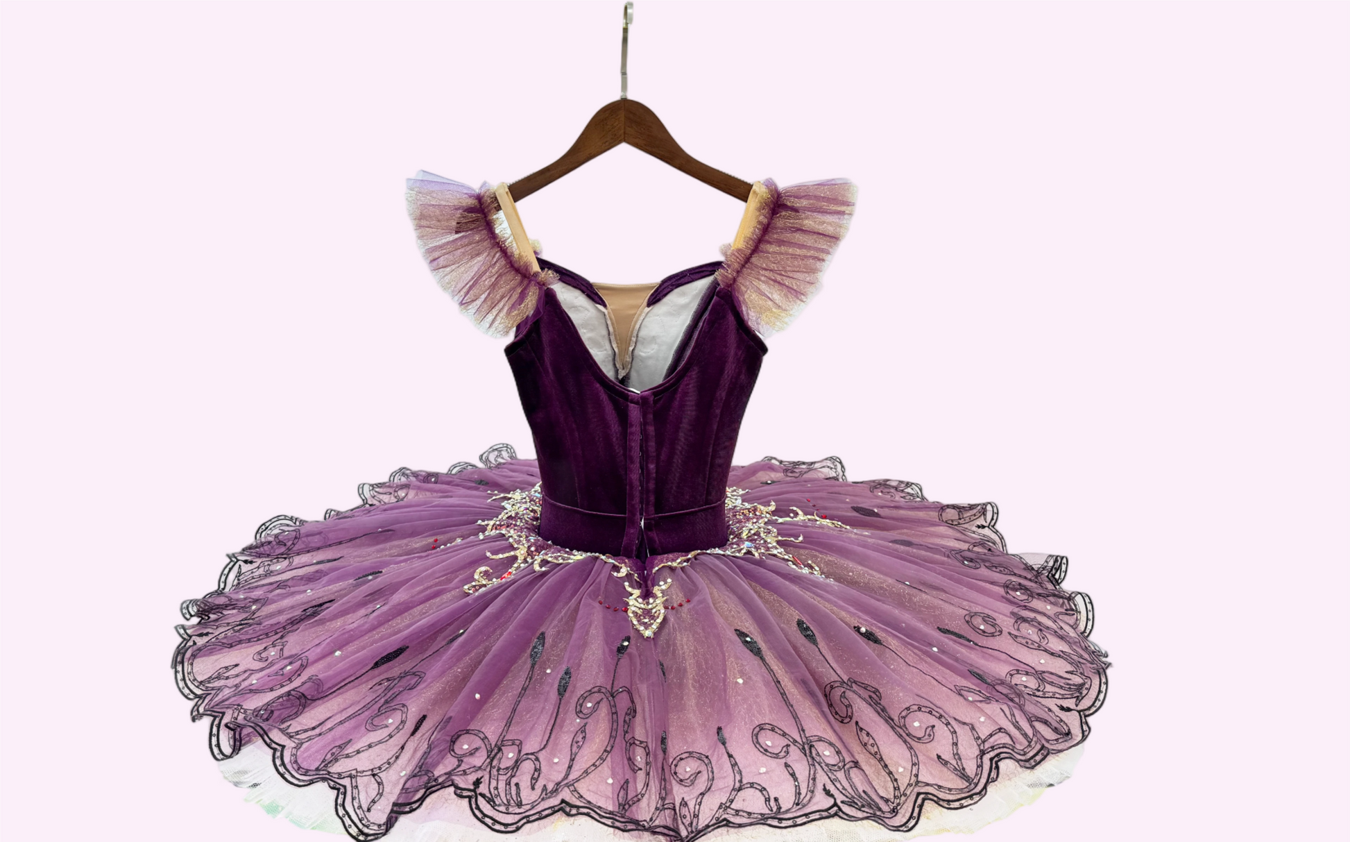 The pancake, twelve layers, hooped tutu skirt matches the color of the corset, and is richly embellished with appliques, sparkles and crystals. The overlay has been created with plum organza.