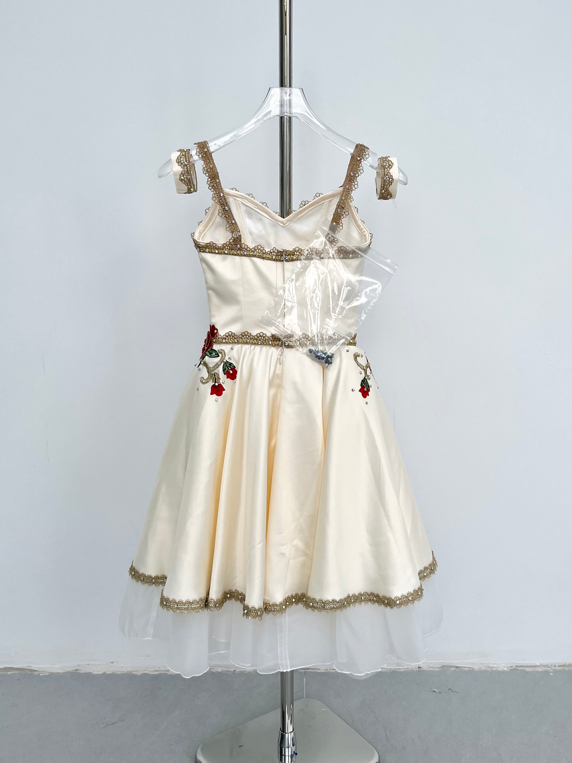 This costume is made with ivory, high quality silk satin, following the original design for this ballet. The top part of the costume features rich gold trim decorations, red flower appliques, green sequins and crystals.