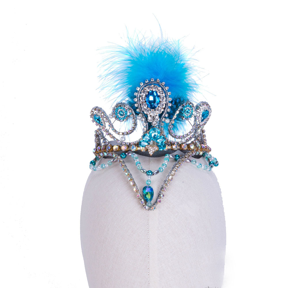 Stunning hand made head piece on a silver base with blue crystals. Decorated with a blue feather and boasting a beautiful front drop. Designed by a famous artist.