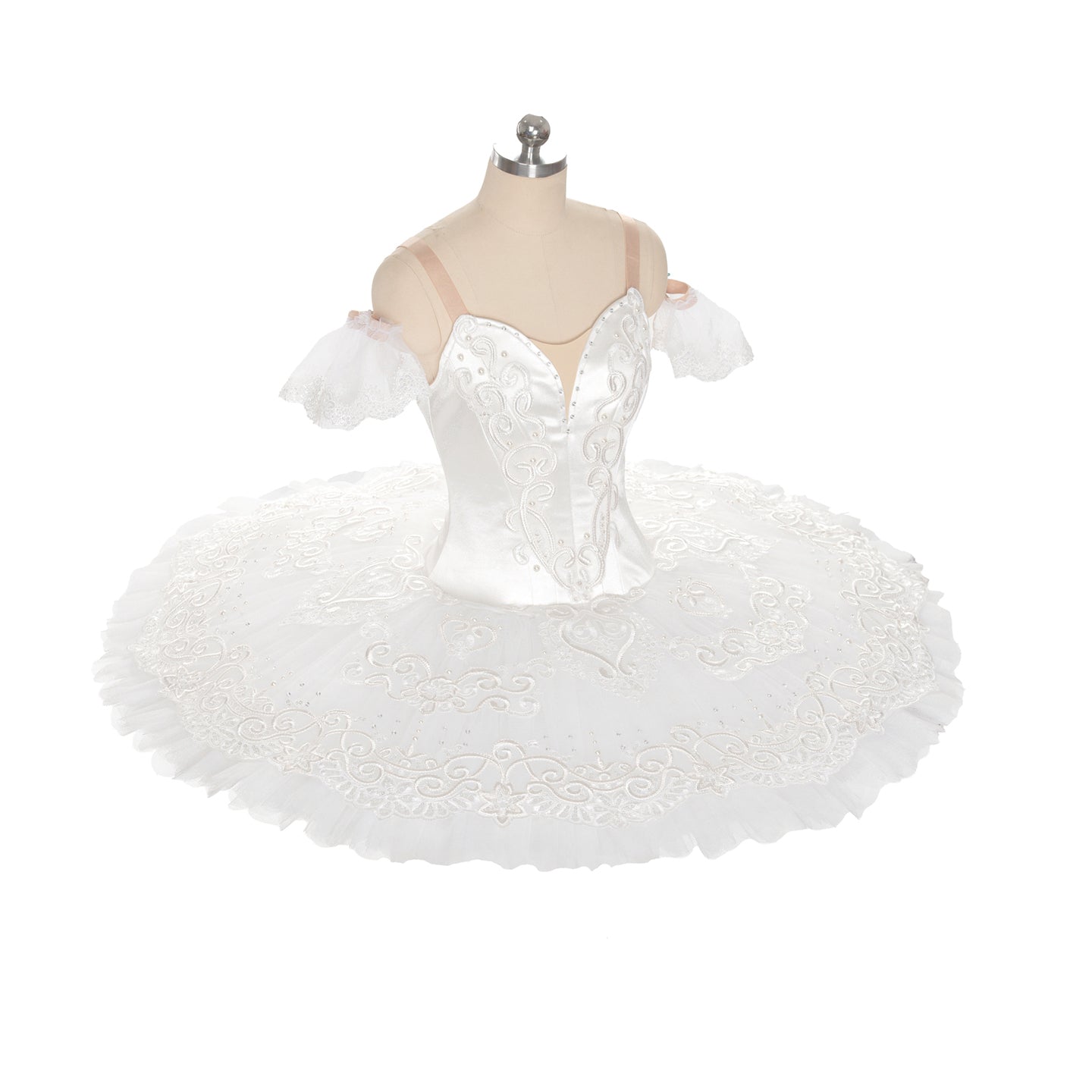 Professional, 12 layers tutu skirt, decorated with white appliques and crystals.