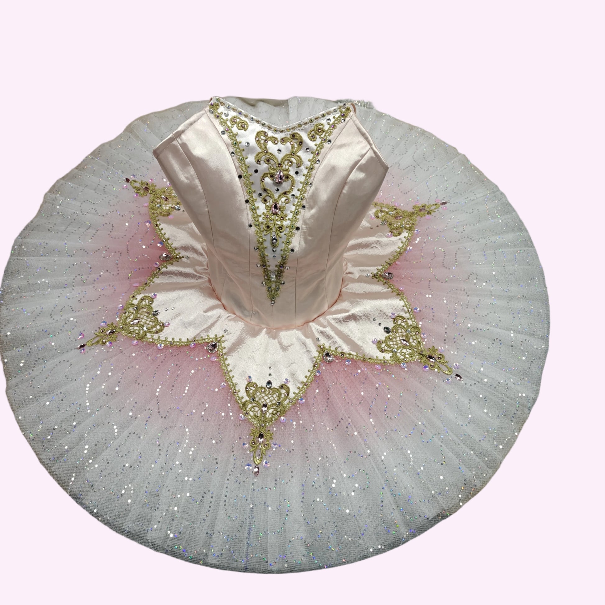 This professional tutu is just amazing! Made with pastel pink satin and fully decorated in gold, this tutu is suitable for any grand pas or classical role (Sugar Plum Fairy, Princess Aurora, Queen of the Dryads, Coppelia, Fairies etc).