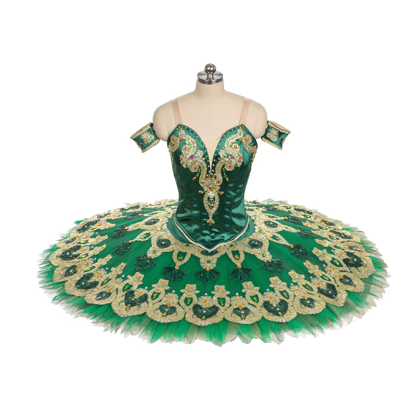 This exclusive tutu is one of our latest creations. The bodice is made with deep, emerald green satin, and features a very pretty, long V cut with a nude insert. The whole V-shaped bodice is embellished with gold trims, and appliques, and crystals. The professional pancake tutu skirt is made with emerald green tulle. The top layer of the skirt is entirely embellished with golden appliques and crystals.,