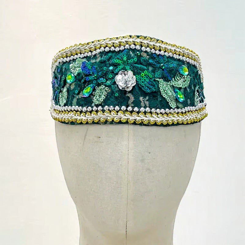 The emerald short top is entirely made of sequins and is extremely shiny. Golden trims are all around the top.