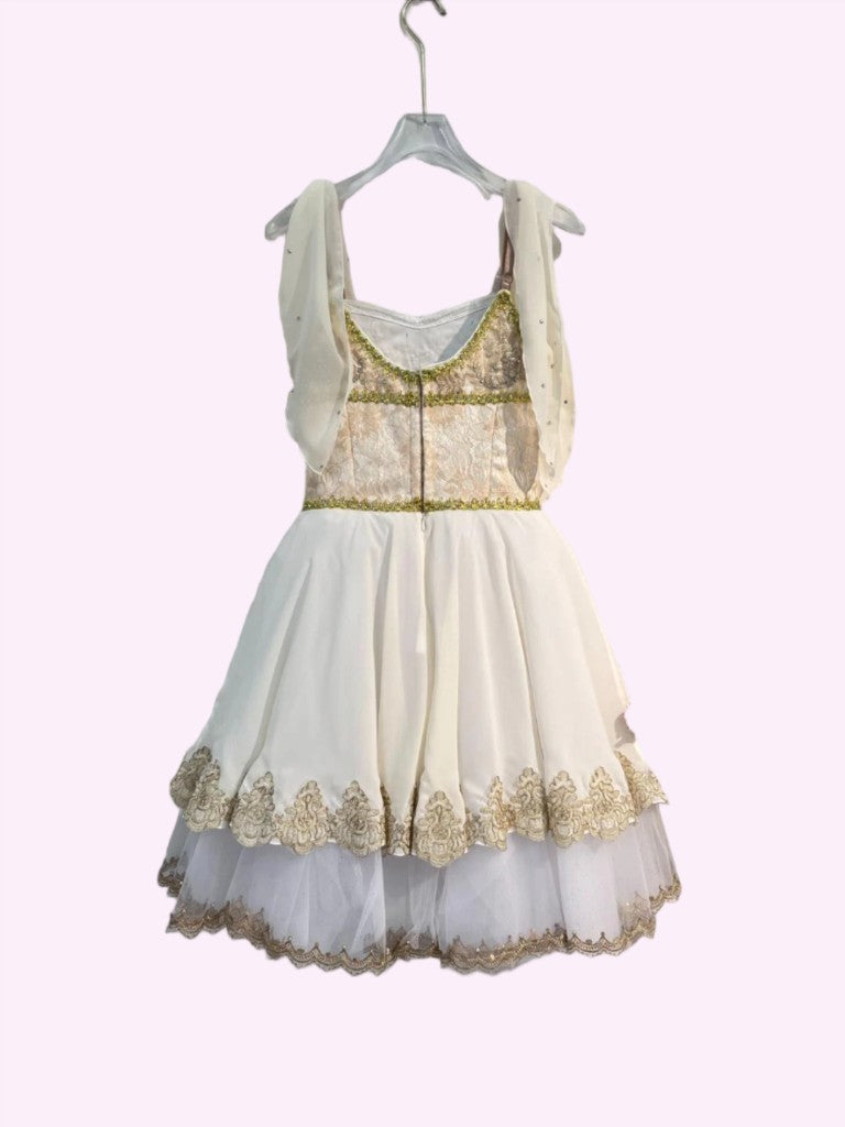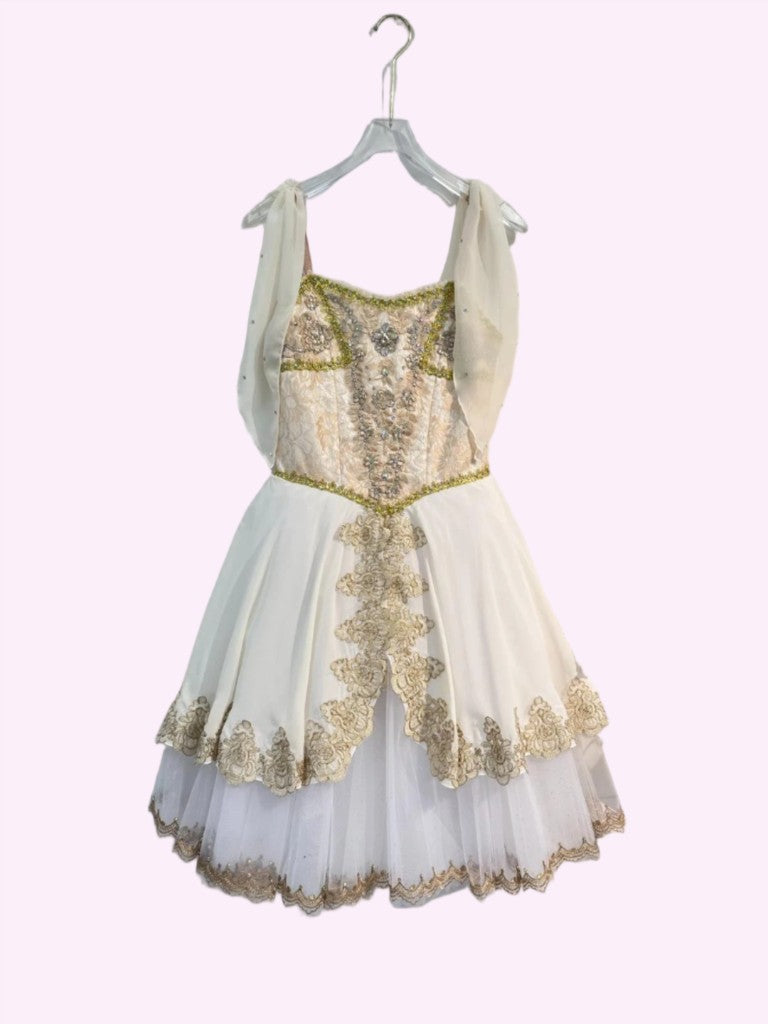 Ivory brocade bodice with slightly V shaped neck and nude straps. The bodice is richly decorated in gold and crystals. Chiffon matching scarves attached to the straps. The Romantic tutu skirt is made with ivory tulle and mesh, and features the traditional gold decoration, and overlay typical of this role.