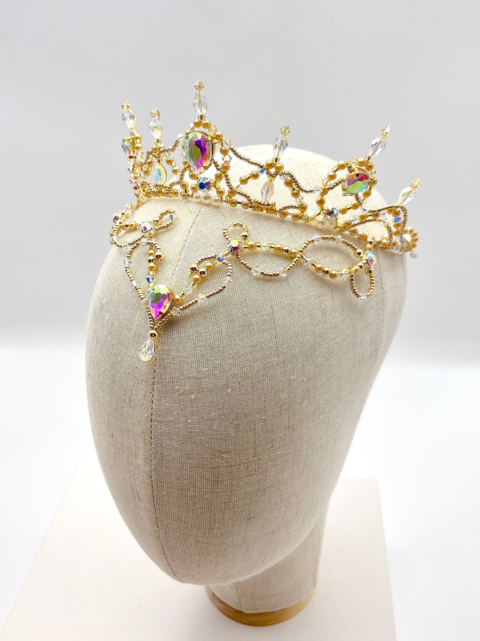 This tsarina tiara features a golden frame and AB crystals as well as zirconia.