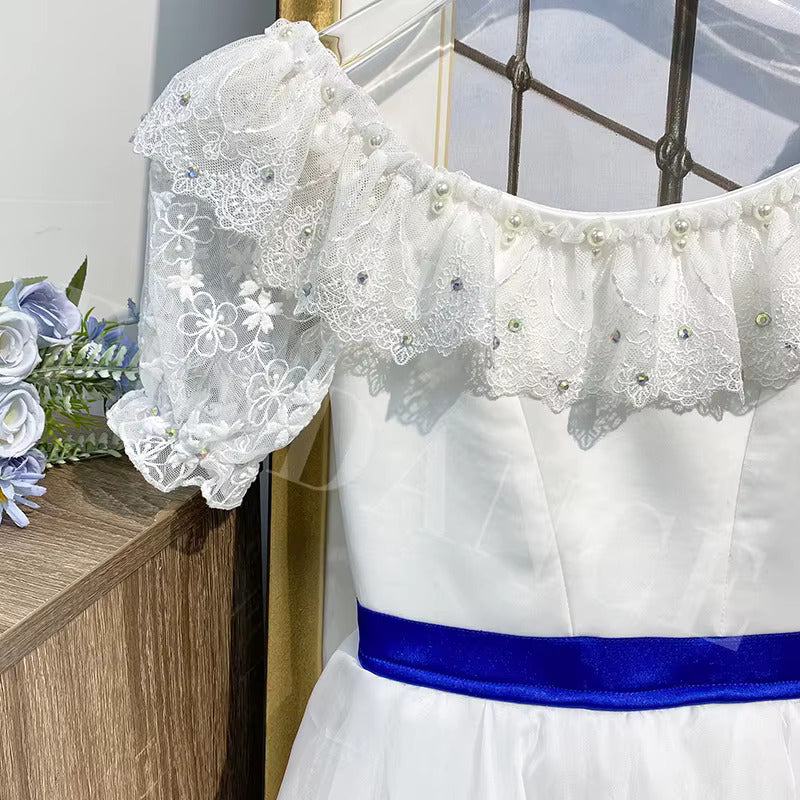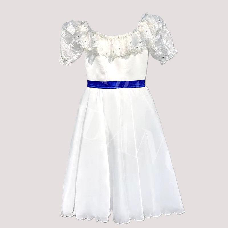 White bodice with round neck with lace collar and short sleeves. Blue satin belt fastening in the back with a big bow.