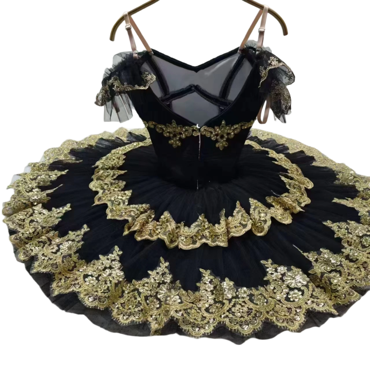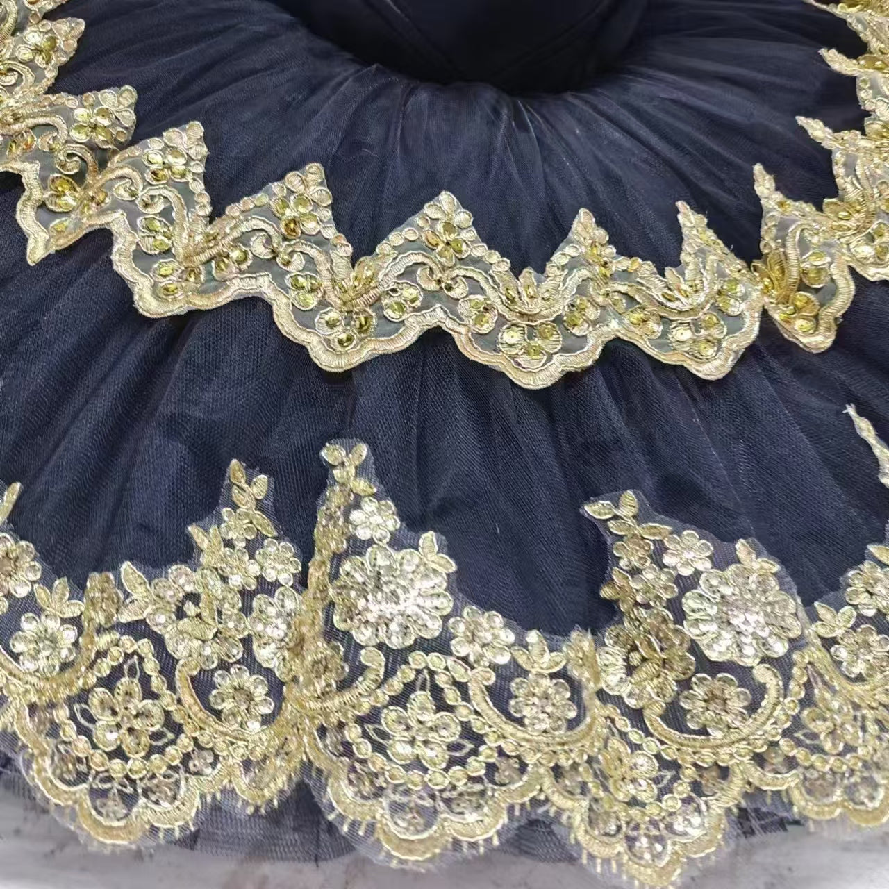 The pancake, 12 layers tutu skirt is black. The decorations on the tutu overlay are very rich and made with different types of golden shiny lace, and crystals.