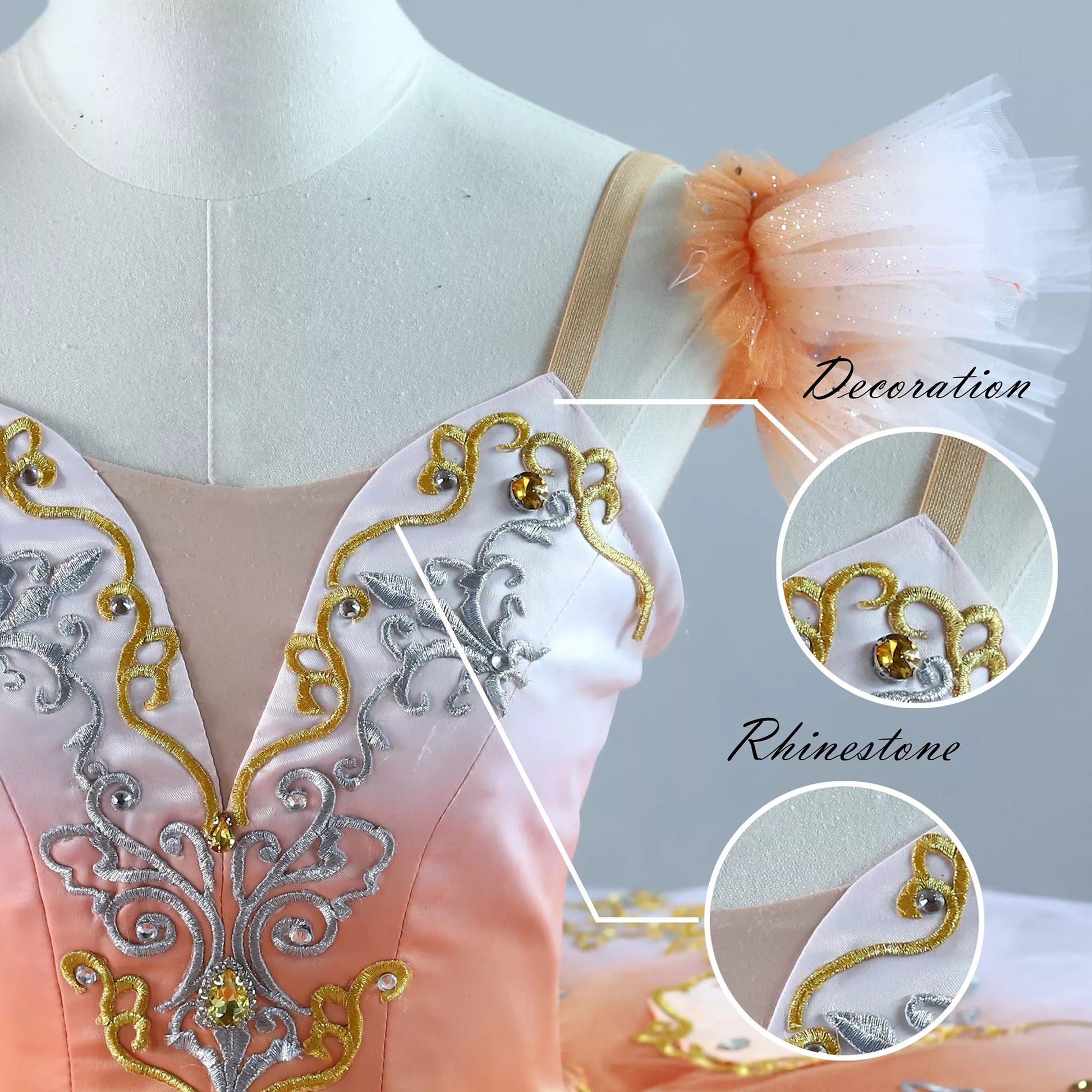 The pancake tutu skirt is peach in the top part, and white on the edges. There are silver and gold appliques sewn all over the skirt, as well as peach satin inserts, and clear crystals.