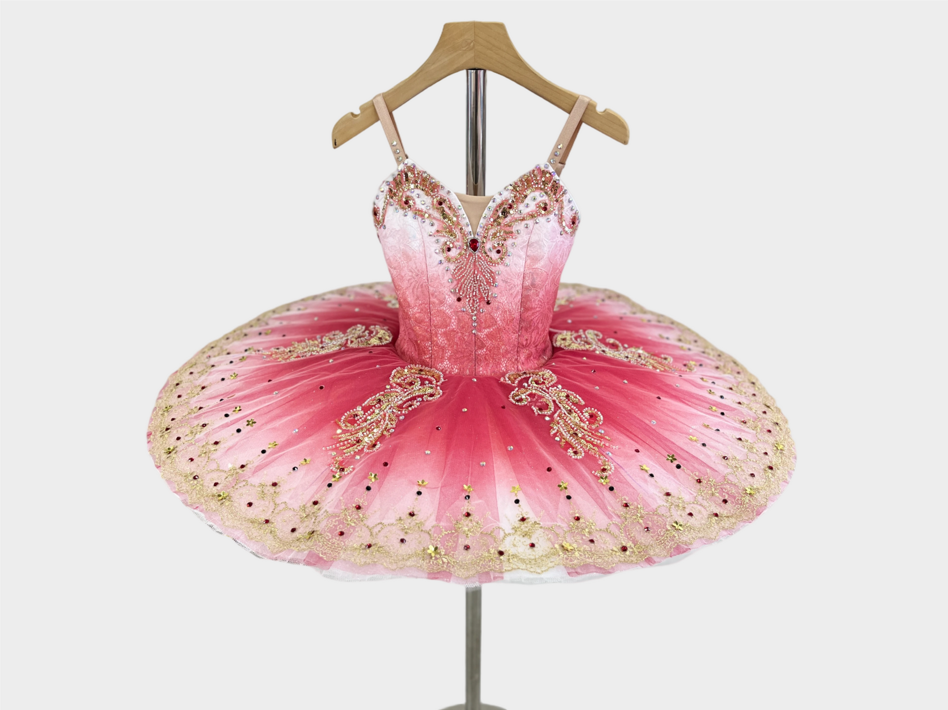 This professional stage costume featurs lovey shades of ombre deep coral fading to pink and white.