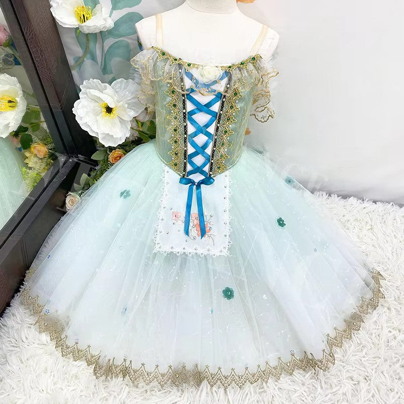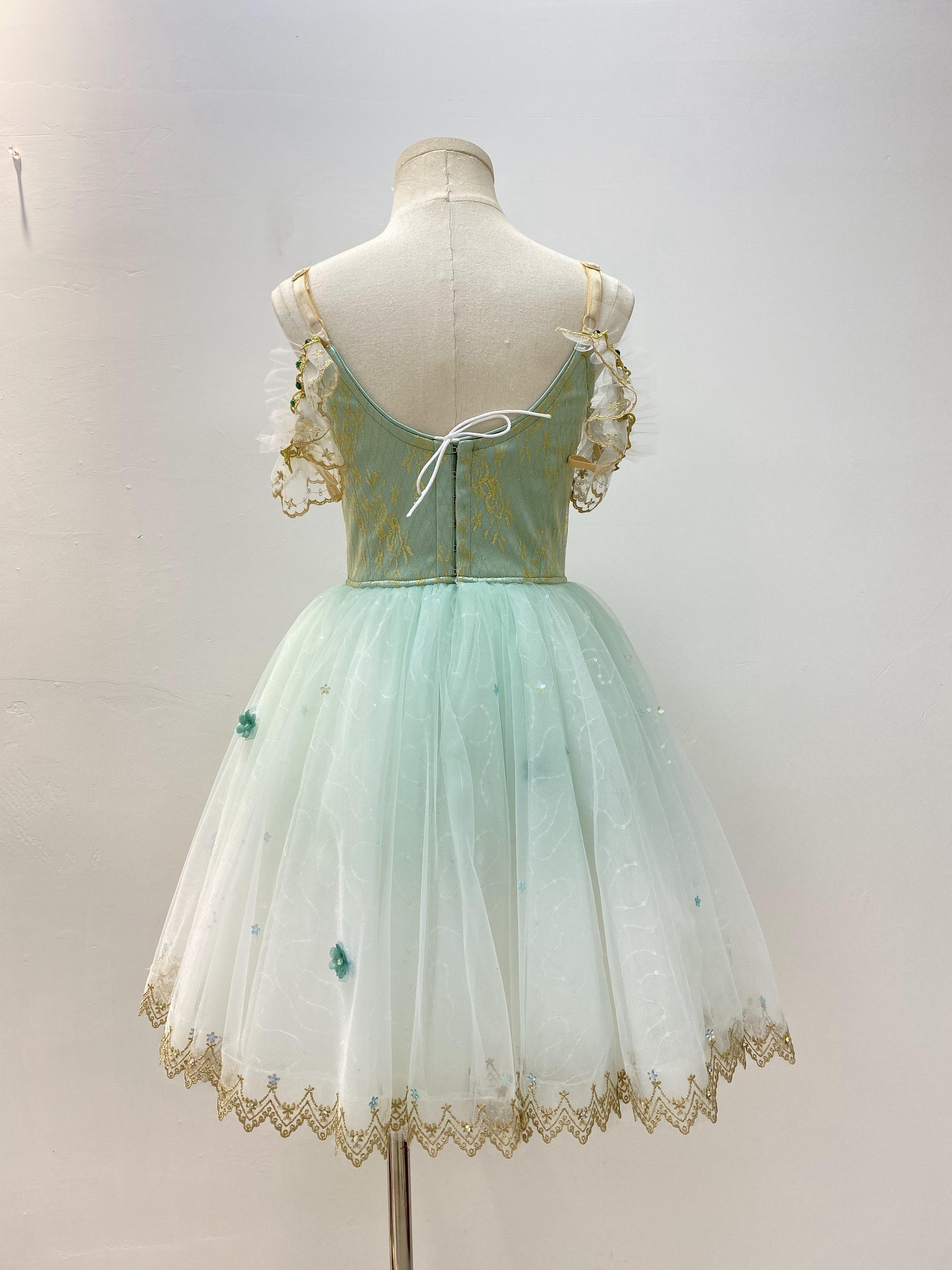 The professional Romantic tutu skirt is pale green and embellished with green flower appliques, a small apron, and golden lace on the edges.