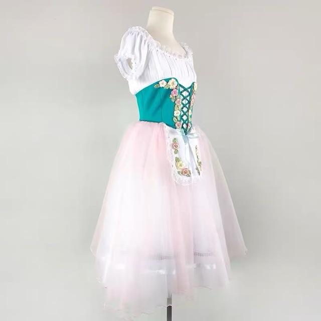 Professional Romantic tutu for the role of Lise in "La Fille Mal Gardee". Ocean blue, satin bodice with white pleated undershirt and typical laced pattern. Floral decoration and white short sleeves.