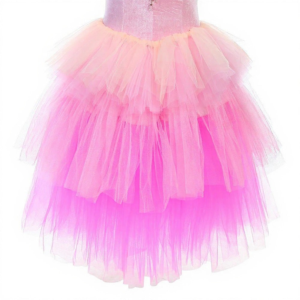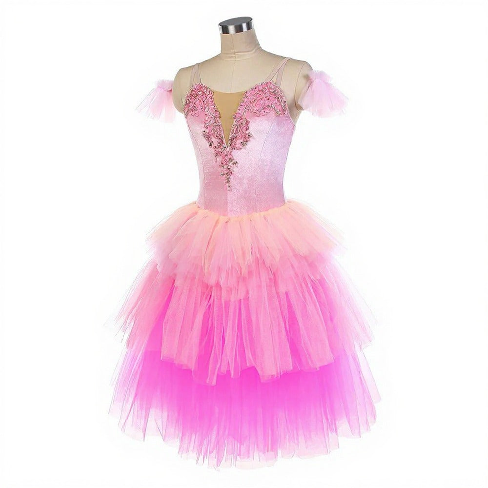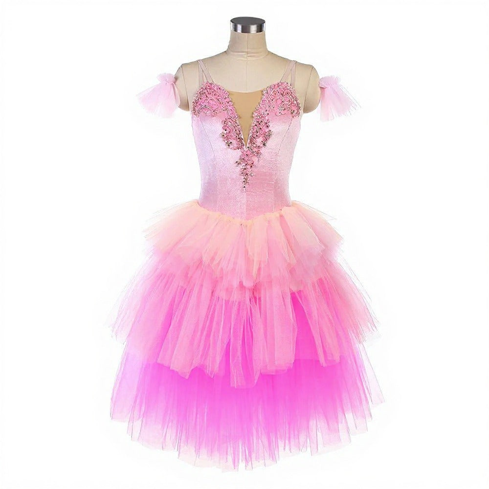 The Romantic length tutu skirt is made with three layers of graded pink chiffon, starting with pale peach, and ending deep pink. The costume is inspired by the original costume worn by American Ballet Theatre's dancers in the Waltz of the Flowers.