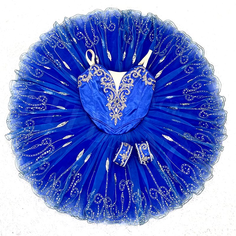 The dark blue, satin bodice, is richly decorated with silver appliques and crystals. Blue, matching arm bracelets are included. The professional, twelve layers tutu skirt, features a wonderful shade of royal blue. This tutu skirt will capture the audience's attention. Lavish decoration is on the skirt: silver appliques, blue trims, sequins and stones.