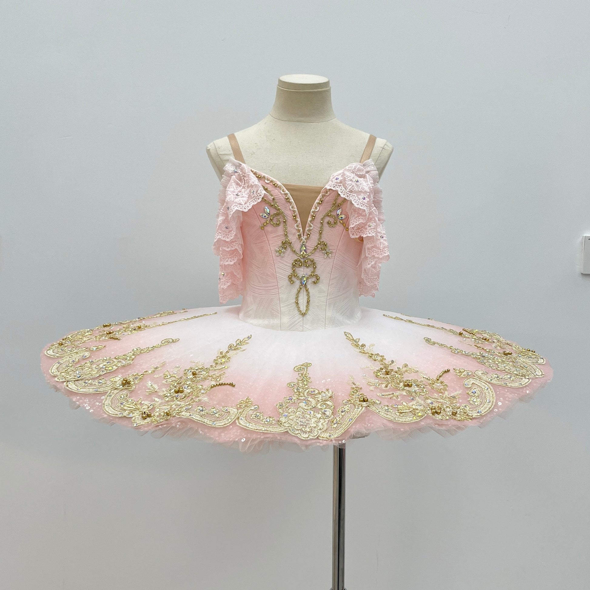 The bodice is a professional one: it fastens in the back with a double row of hooks and eyes and is made with ombre' dyed jaquard fabric, featuring gradient shades of pink. There is a deep V neck with nude insert  and pink lace cap sleeves attached to the nude straps. The decoration on the bodice is very rich: we used golden appliques, sequins, trims and crystals.