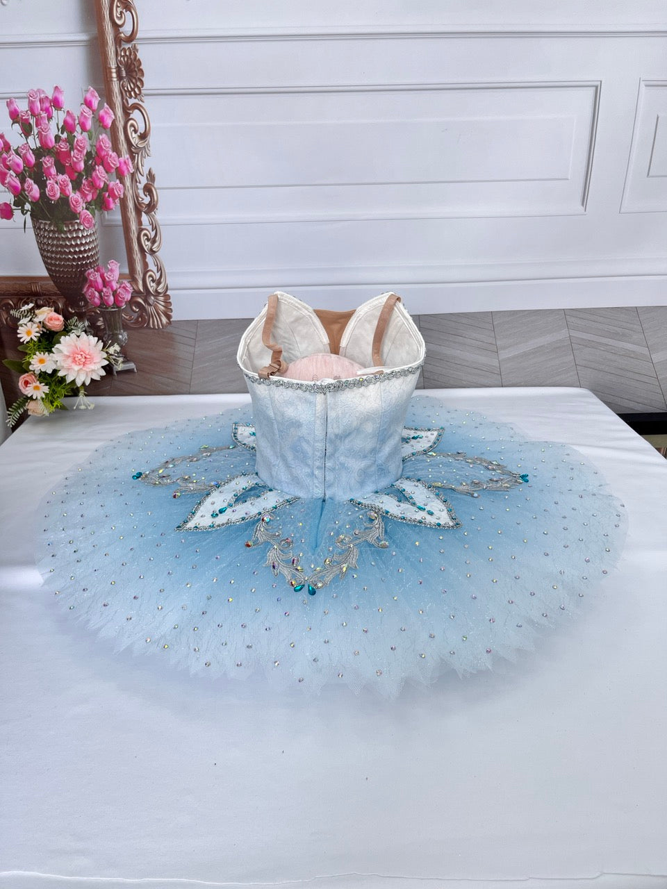 It features a satin pale blue, ombre' dyed bodice, covered with pale blue lace, a nude V insert and an extremely rich decoration with silver appliques, crystals and trims. The bodice fastens in the back with a double row of hooks and eyes. The skirt is the most beautifu part of this costume, featuring a twelve layers, pale blue, ombre' dyed tulle skirt, and a glittery tulle overlay richly embellished with hundreds of sparkles and crystals. The tutu skirt also boasts a beautiful flower-shaped motif, made with pale blue brocade inserts, silver shiny appliques, white and blue crystals.